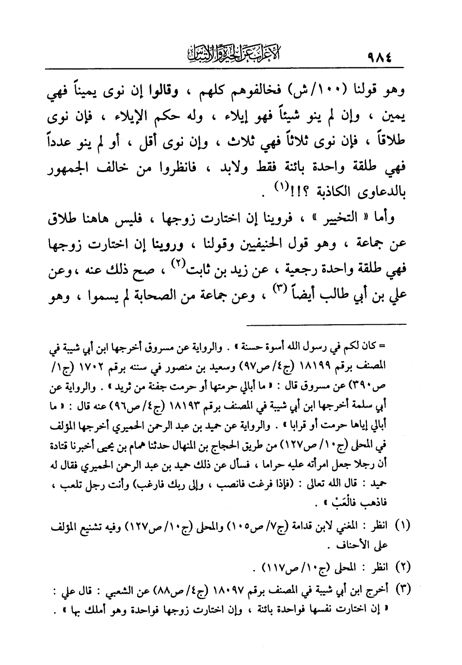 (¬١) انظر: المغني لابن قدامة (ج ٧/ ص ١٠٥) والمحلى (ج ١٠/ ص ١٢٧) وفيه تشنيع المؤلف على الأحناف.