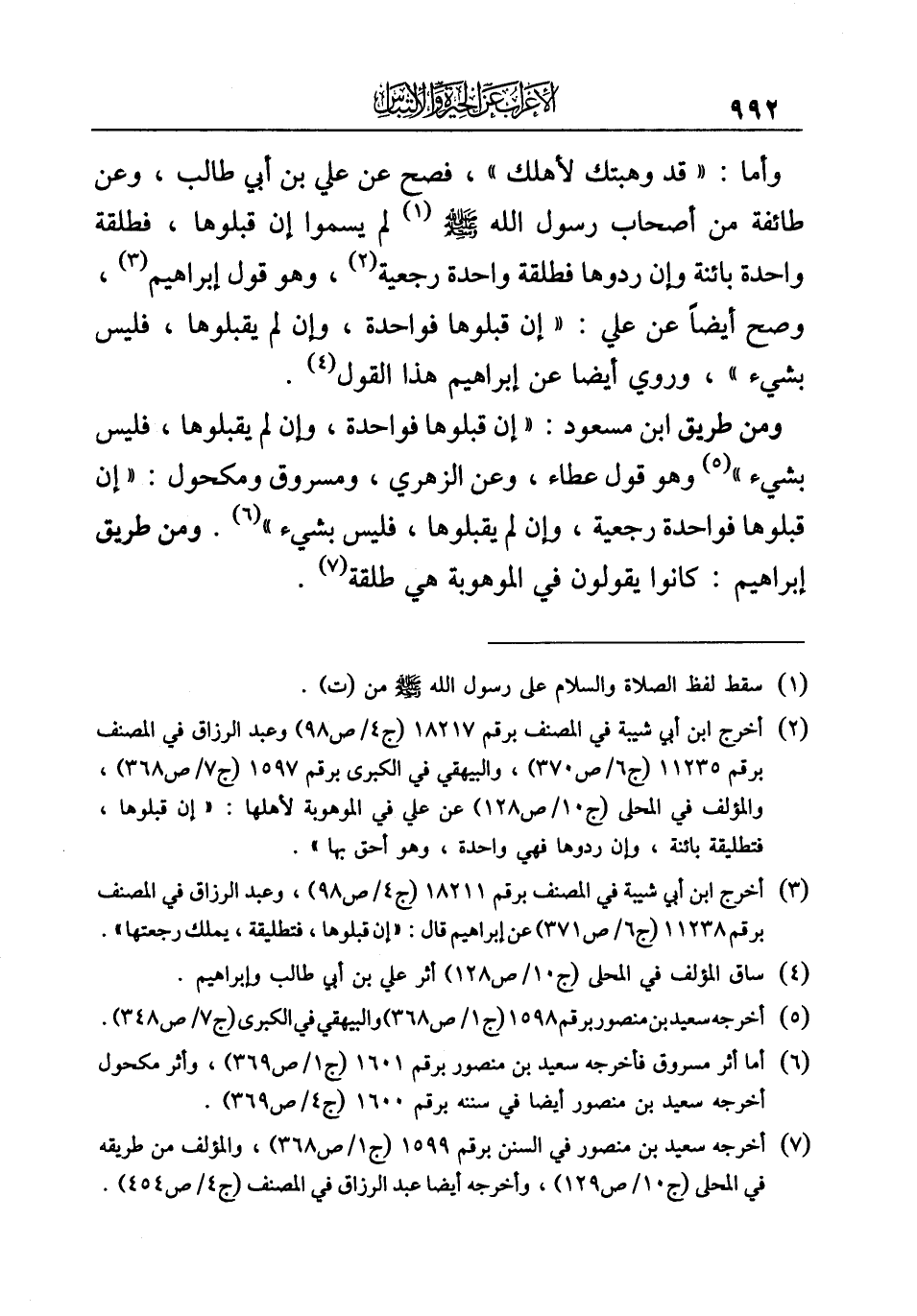 (¬٧) أخرجه سعيد بن منصور في السنن برقم ١٥٩٩ (ج ١/ ص ٣٦٨)، والمؤلف من طريقه في المحلى (ج ١٠/ ص ١٢٩)، وأخرجه أيضا عبد الرزاق في المصنف (ج ٤/ ص ٤٥٤).