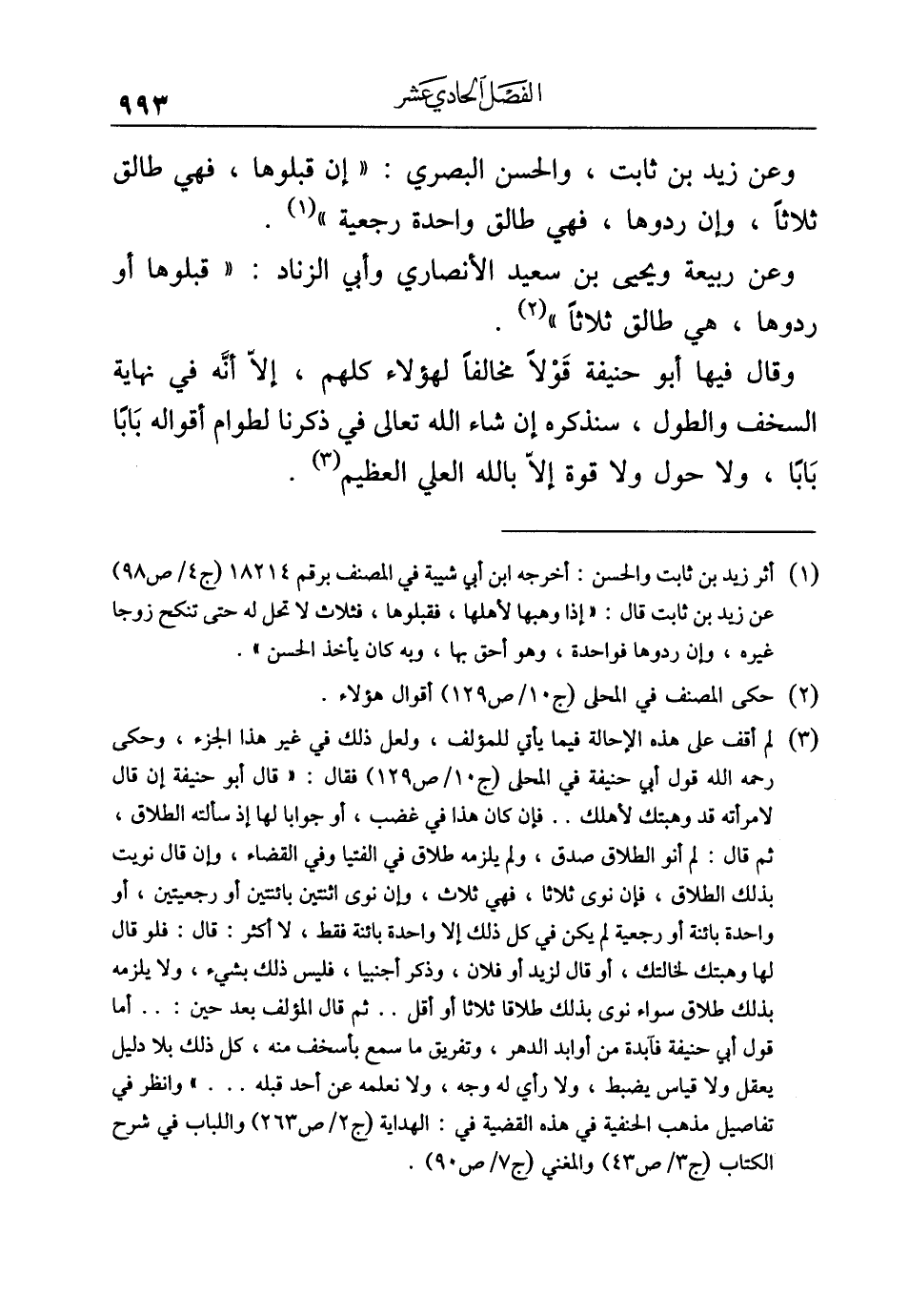 (¬٣) لم أقف على هذه الإحالة فيما يأتي للمؤلف، ولعل ذلك في غير هذا الجزء، وحكى رحمه الله قول أبي حنيفة في المحلى (ج ١٠/ ص ١٢٩) فقال: "قال أبو حنيفة إن قال لامرأته قد وهبتك لأهلك .. فإن كان هذا في غضب، أو جوابا لها إذ سألته الطلاق، ثم قال: لم أنو الطلاق صدق، ولم يلزمه طلاق في الفتيا وفي القضاء، وإن قال نويت بذلك الطلاق، فإن نوى ثلاثا، فهي ثلاث، وإن نوى اثنتين باثنتين أو رجعيتين، أو واحدة بائنة أو رجعية لم يكن في كل ذلك إلا واحدة بائنة فقط، لا أكثر: قال: فلو قال لها وهبتك لخالتك، أو قال لزيد أو فلان، وذكر أجنبيا، فليس ذلك بشيء، ولا يلزمه بذلك طلاق سواء نوى بذلك طلاقا ثلاثا أو أقل .. ثم قال المؤلف بعد حين: .. أما قول أبي حنيفة فآبدة من أوابد الدهر، وتفريق ما سمع بأسخف منه، كل ذلك بلا دليل يعقل ولا قياس يضبط، ولا رأي له وجه، ولا نعلمه عن أحد قبله ... " وانظر في تفاصيل مذهب الحنفية في هذه القضية في: الهداية (ج ٢/ ص ٢٦٣) واللباب في شرح الكتاب (ج ٣/ ص ٤٣) والمغني (ج ٧/ ص ٩٠).