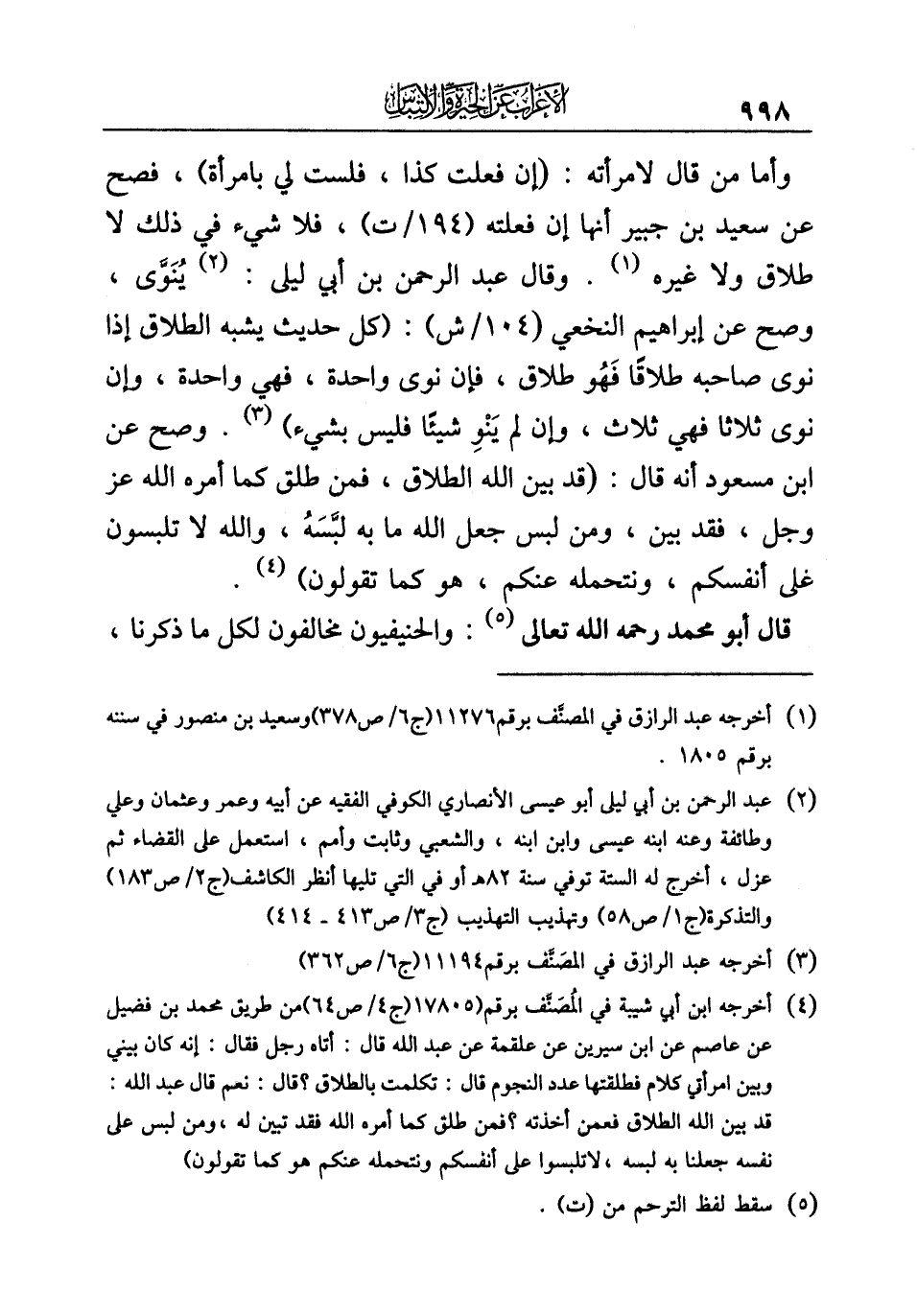 (¬٤) أخرجه ابن أبي شيبة في المُصَنَّف برقم (١٧٨٠٥) (ج ٤/ ص ٦٤) من طريق محمد بن فضيل عن عاصم عن ابن سيرين عن علقمة عن عبد الله قال: أتاه رجل فقال: إنه كان بيني وبين امرأتي كلام فطلقتها عدد النجوم قال: تكلمت بالطلاق؟ قال: نعم قال عبد الله: قد بين الله الطلاق فعمن أخذته؟ فمن طلق كما أمره الله فقد تبين له، ومن لبس على نفسه جعلنا به لبسه، لا تلبسوا على أنفسكم ونتحمله عنكم هو كما تقولون).