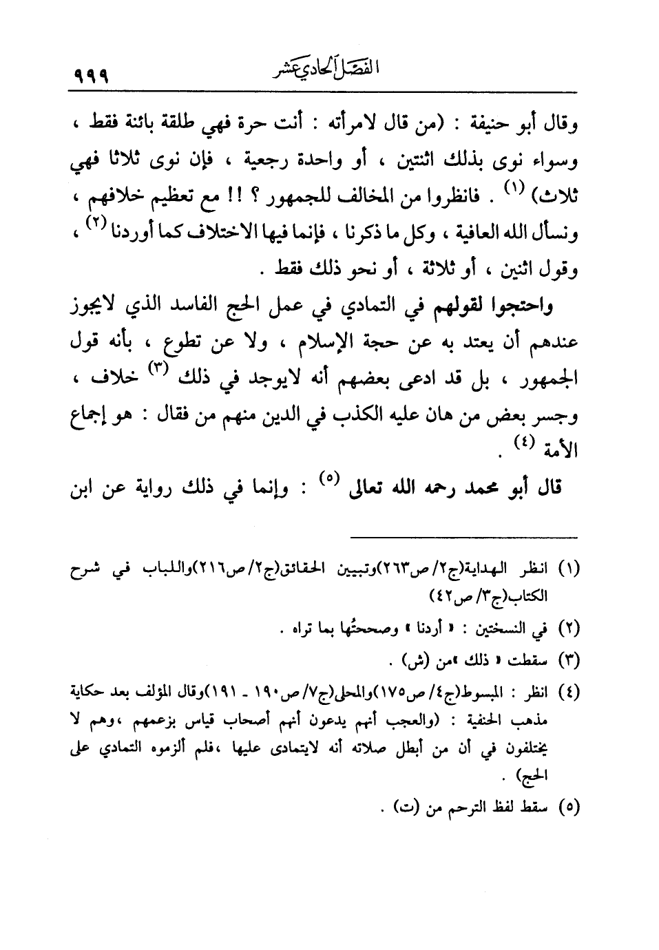 وقال أبو حنيفة: (من قال لامرأته: أنت حرة فهي طلقة بائنة فقط، وسواء نوي بذلك اثنتين، أو واحدة رجعية، فإن نوى ثلاثا فهي ثلاث) (¬١). فانظروا من المخالف للجمهور؟ ! ! مع تعظيم خلافهم، ونسأل الله العافية، وكل ما ذكرنا، فإنما فيها الاختلاف كما أوردنا (¬٢)، وقول اثنين، أو ثلاثة، أو نحو ذلك فقط.