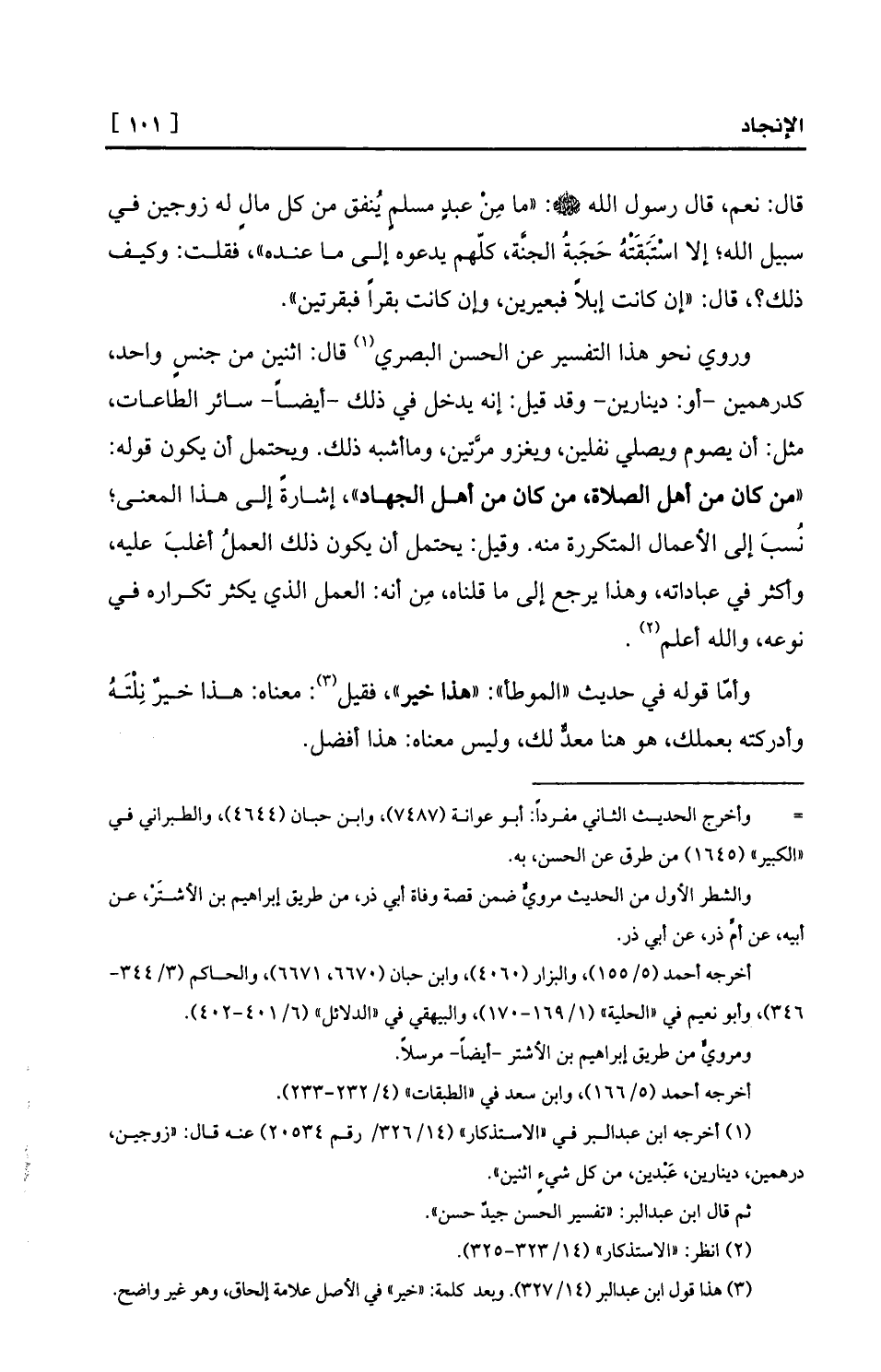 وروي نحو هذا التفسير عن الحسن البصري (¬1) قال: اثنين من جنسٍ واحد، كدرهمين -أو: دينارين- وقد قيل: إنه يدخل في ذلك -أيضاً- سائر الطاعات، مثل: أن يصوم ويصلي نفلين، ويغزو مرَّتين، وماأشبه ذلك. ويحتمل أن يكون قوله: «من كان من أهل الصلاة، من كان من أهل الجهاد» ، إشارةً إلى هذا المعنى؛ نُسبَ إلى الأعمال المتكررة منه. وقيل: يحتمل أن يكون ذلك العملُ أغلبَ عليه، وأكثر في عباداته، وهذا يرجع إلى ما قلناه، مِن أنه: العمل الذي