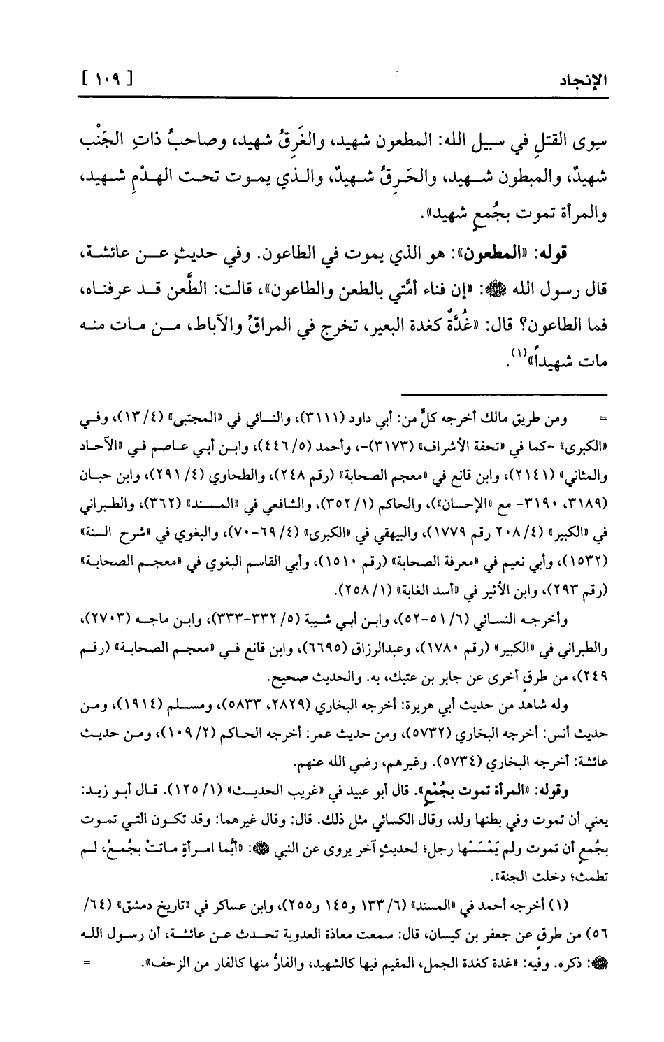 قوله: «المطعون» : هو الذي يموت في الطاعون. وفي حديثٍ عن عائشة، قال رسول الله - صلى الله عليه وسلم -: «إن فناء أمَّتي بالطعن والطاعون» ، قالت: الطَّعن قد عرفناه، فما الطاعون؟ قال: «غُدَّةٌ كغدة البعير، تخرج في المراقِّ والآباط، من مات منه مات شهيداً» (¬1) .