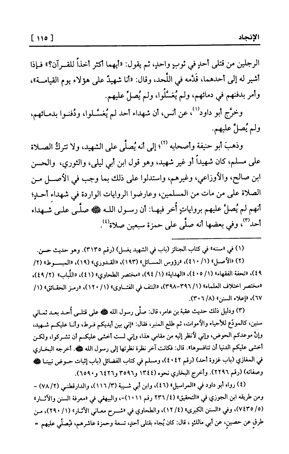 (¬4) رواه أبو داود في «المراسيل» (46) ، وابن أبي شيبة (3/116) ، والدارقطني (2/78) -ومن طريقه ابن الجوزي في «التحقيق» (4/236 رقم 1011) -، والبيهقي في «معرفة السنن والآثار» (5/7435) ، وفي «السنن الكبرى» (4/12) ، والطحاوي في «شرح معاني الآثار» (1/290) ، من طرقٍ عن حصينٍ، عن أبي مالكٍ، قال: كان يُجاء بقتلى أحدٍ، تسعة وحمزة عاشرهم، فيُصلِّي عليهم =
