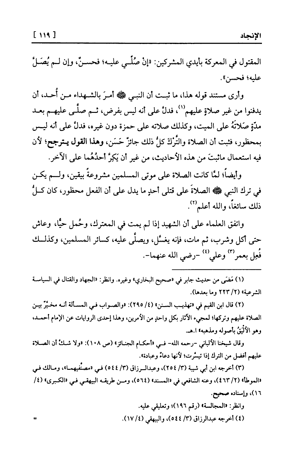 المقتول في المعركة بأيدي المشركين: «إنْ صُلِّي عليه؛ فحسنٌ، وإن لم يُصَلَّ عليه؛ فحسن» .