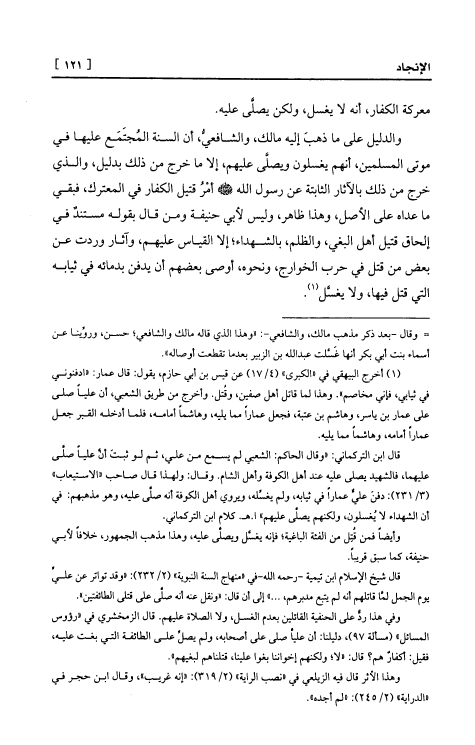 وفي هذا ردٌّ على الحنفية القائلين بعدم الغسل، ولا الصلاة عليهم. قال الزمخشري في «رؤوس المسائل» (مسألة 97) ، دليلنا: أن علياًّ صلى على أصحابه، ولم يصلِّ على الطائفة التي بغت عليه، فقيل: أكفارٌ هم؟ قال: «لا؛ ولكنهم إخواننا بغوا علينا، قتلناهم لبغيهم» .
