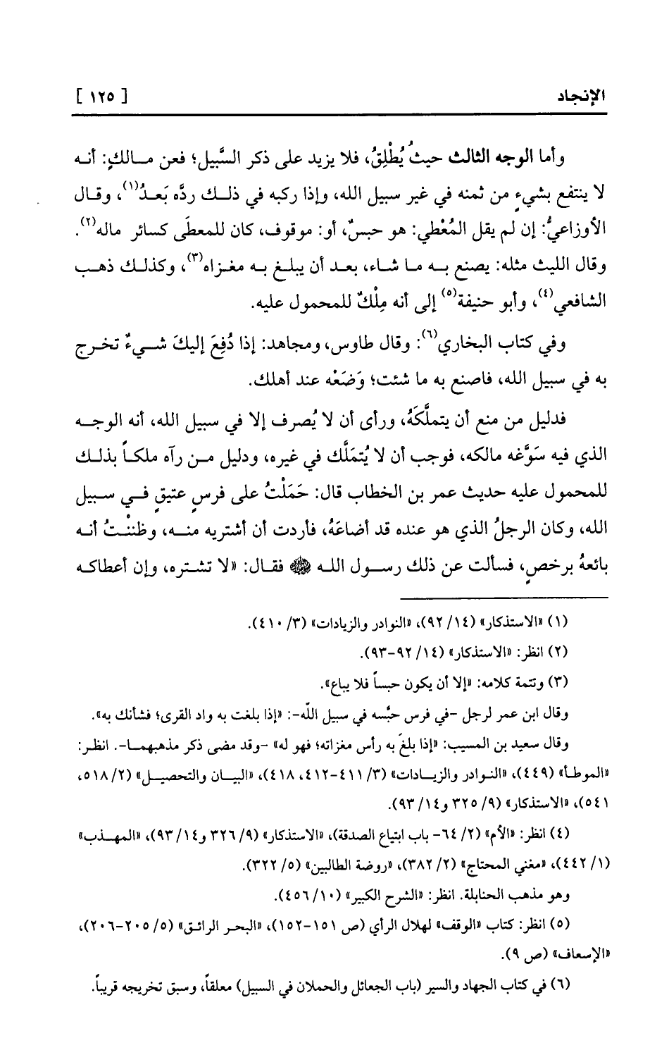 وأما الوجه الثالث حيثُ يُطْلِقُ، فلا يزيد على ذكر السَّبيل؛ فعن مالكٍ: أنه لا ينتفع بشيءٍ من ثمنه في غير سبيل الله، وإذا ركبه في ذلك ردَّه بَعدُ (¬1) ، وقال الأوزاعيُّ: إن لم يقل المُعْطي: هو حبسٌ، أو: موقوف، كان للمعطَى كسائر ماله (¬2) . وقال الليث مثله: يصنع به ما شاء، بعد أن يبلغ به مغزاه (¬3) ، وكذلك ذهب الشافعي (¬4) ، وأبو حنيفة (¬5) إلى أنه مِلْكٌ للمحمول عليه.