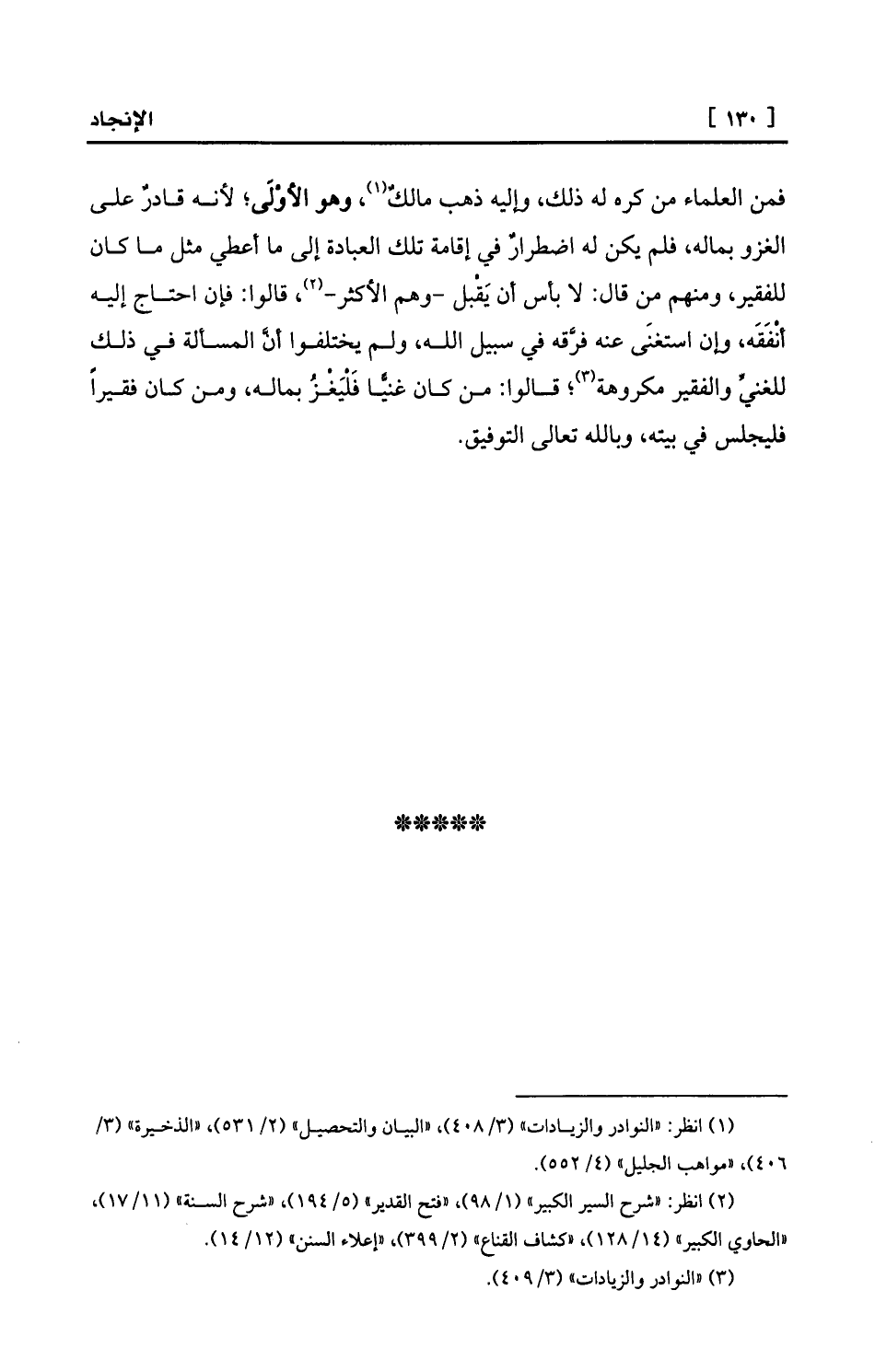 خلافاً، وكلاهما مأجور -إن شاء الله-، كما قد وقع في الحديث المتقدم: «للغازي أجره، وللجاعل أجره، وأجر الغازي» (¬1) ، وأما إن كان غنياً فأعطي كذلك من غير مسألة، فمن العلماء من كره له ذلك، وإليه ذهب مالكٌ (¬2) ، وهو الأوْلَى؛ لأنه قادرٌ على الغزو بماله، فلم يكن له اضطرارٌ في إقامة تلك العبادة إلى ما أعطي مثل ما كان للفقير، ومنهم من قال: لا بأس أن يَقْبل -وهم الأكثر- (¬3) ، قالوا: فإن احتاج إليه أنْفَقَه، وإن استغنَى عنه فرَّقه في سبيل الله، ولم يختلفوا أنَّ المسألة في ذلك للغنيِّ والفقير مكروهة (¬4) ؛ قالوا: من كان غنيًّا فَلْيَغْزُ بماله، ومن كان فقيراً فليجلس في بيته، وبالله تعالى التوفيق.