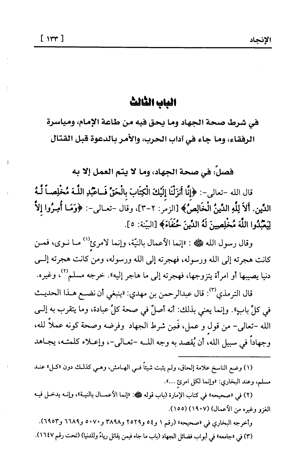 قال الترمذي (¬3) : قال عبد الرحمن بن مهدي: «ينبغي أن نضع هذا الحديث في كلِّ بابٍ» . وإنما يعني بذلك: أنه أصلٌ في صحة كلِّ عبادة، وما يتقرب به إلى الله -تعالى- من قولٍ وعمل، فَمِن شرط الجهاد وفرضه وصحة كونه عملاً لله، وجهاداً في سبيل الله، أن يُقصد به وجه الله -تعالى-، وإعلاء كلمته، يجاهد