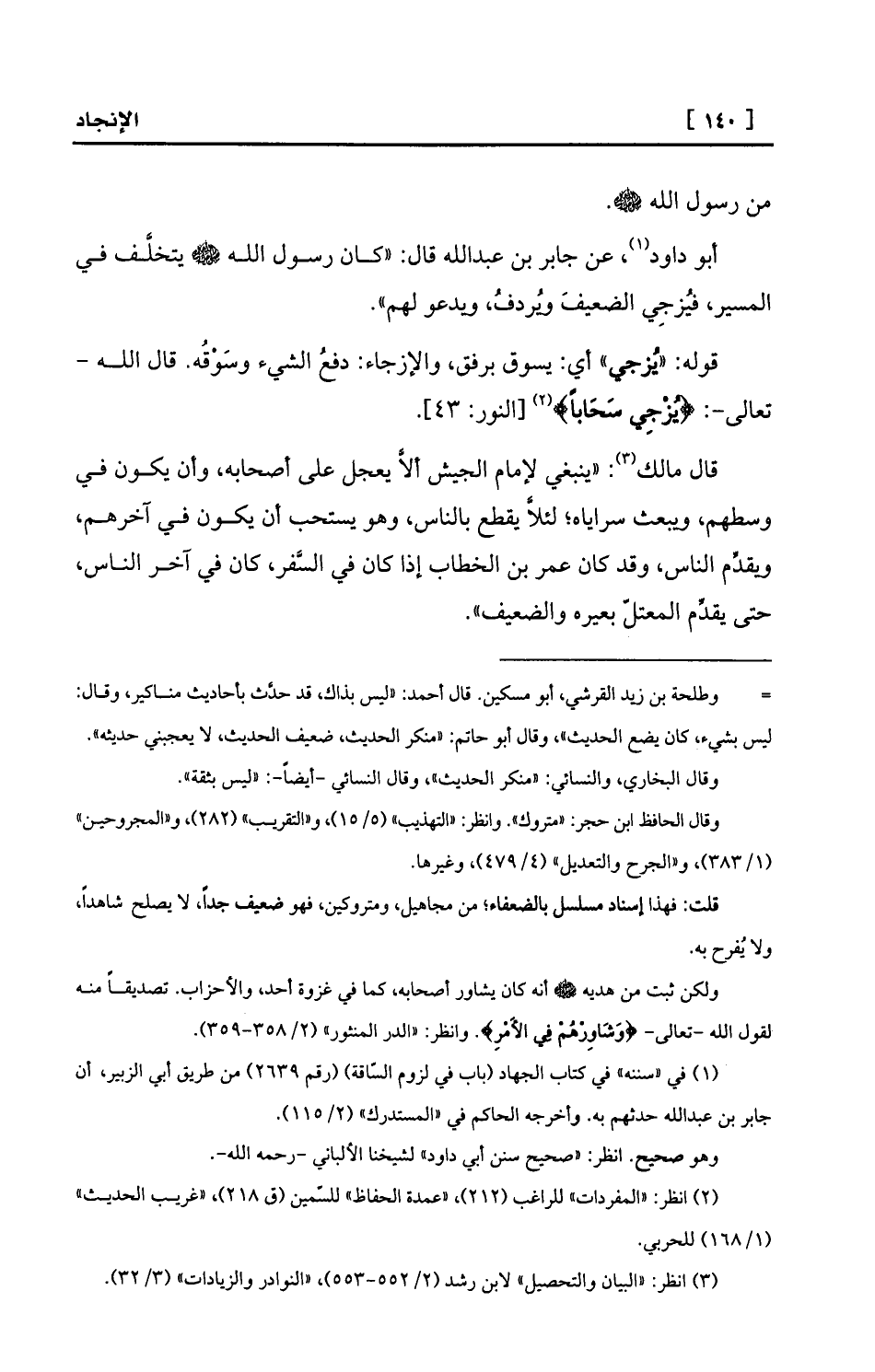 أبو داود (¬1) ، عن جابر بن عبد الله قال: «كان رسول الله - صلى الله عليه وسلم - يتخلَّف في المسير، فيُزجِي الضعيفَ ويُردفُ، ويدعو لهم» .