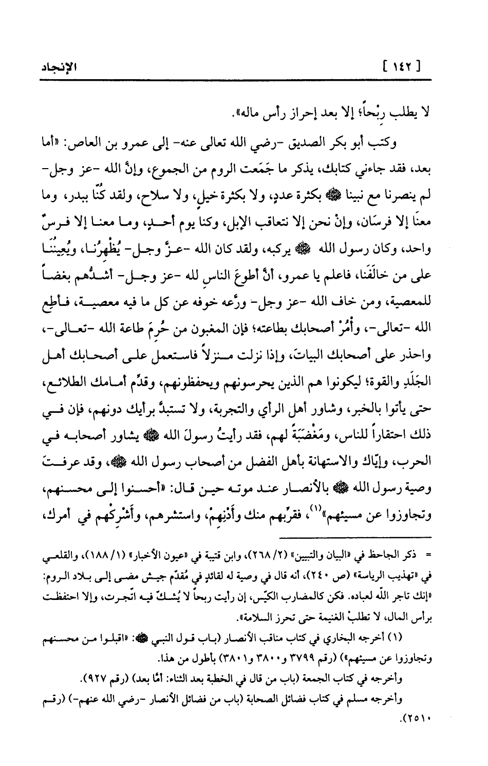 = ذكر الجاحظ في «البيان والتبيين» (2/268) ، وابن قتيبة في «عيون الأخبار» (1/188) ، والقلعي في «تهذيب الرياسة» (ص 240) ، أنه قال في وصية له لقائدٍ في مُقدّم جيش مضى إلى بلاد الروم: «إنك تاجر الله لعباده. فكن كالمضارب الكيّس، إن رأيت ربحاً لا يُشكّ فيه اتّجرت، وإلا احتفظت برأس المال، لا تطلبْ الغنيمة حتى تحرز السلامة» .
