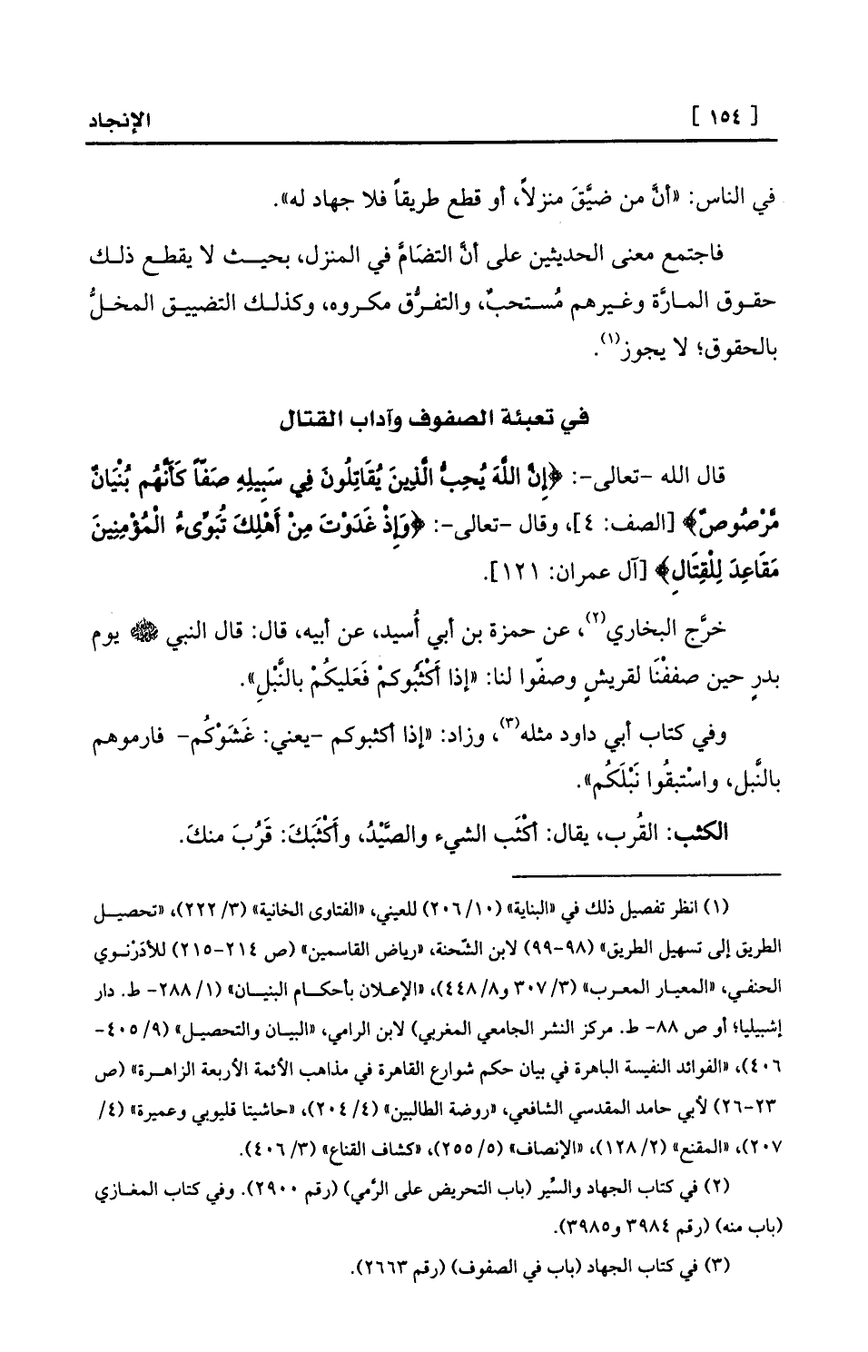 قال الله -تعالى-: {إِنَّ اللَّهَ يُحِبُّ الَّذِينَ يُقَاتِلُونَ فِي سَبِيلِهِ صَفّاً كَأَنَّهُم بُنْيَانٌ مَّرْصُوصٌ} [الصف: 4] ، وقال -تعالى-: {وَإِذْ غَدَوْتَ مِنْ أَهْلِكَ تُبَوِّىءُ الْمُؤْمِنِينَ مَقَاعِدَ لِلْقِتَالِ} [آل عمران: 121] .
