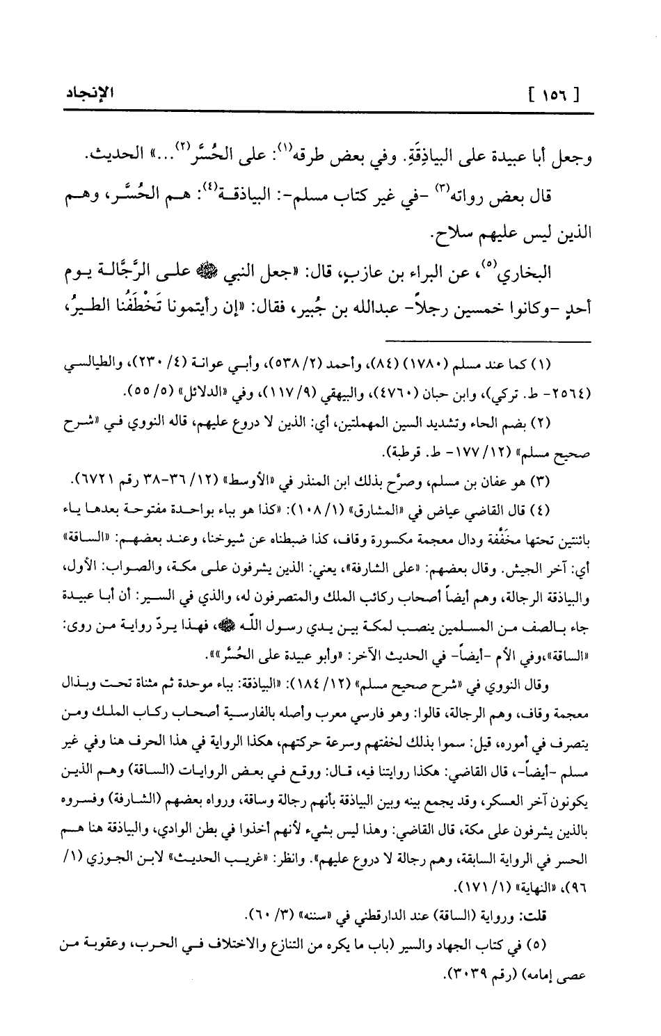 (¬4) قال القاضي عياض في «المشارق» (1/108) : «كذا هو بباء بواحدة مفتوحة بعدها ياء بائنتين تحتها مخَفَّفة ودال معجمة مكسورة وقاف، كذا ضبطناه عن شيوخنا، وعند بعضهم: «الساقة» أي: آخر الجيش. وقال بعضهم: «على الشارفة» ، يعني: الذين يشرفون على مكة، والصواب: الأول، والبياذقة الرجالة، وهم أيضاً أصحاب ركائب الملك والمتصرفون له، والذي في السير: أن أبا عبيدة جاء بالصف من المسلمين ينصب لمكة بين يدي رسول الله - صلى الله عليه وسلم -، فهذا يردّ رواية من روى: «الساقة» ، وفي الأم -أيضاً- في الحديث الآخر: «وأبو عبيدة على الحُسَّر» » .