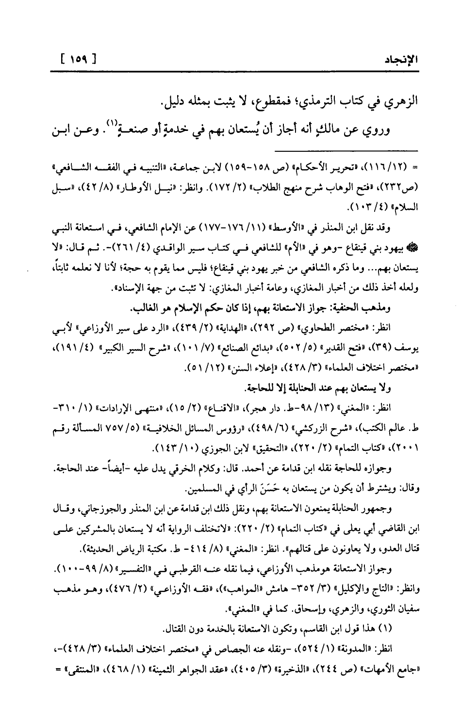 وجواز الاستعانة هومذهب الأوزاعي، فيما نقله عنه القرطبي في «التفسير» (8/99-100) . وانظر: «التاج والإكليل» (3/352- هامش «المواهب» ) ، «فقه الأوزاعي» (2/476) ، وهو مذهب سفيان الثوري، والزهري، وإسحاق. كما في «المغني» .