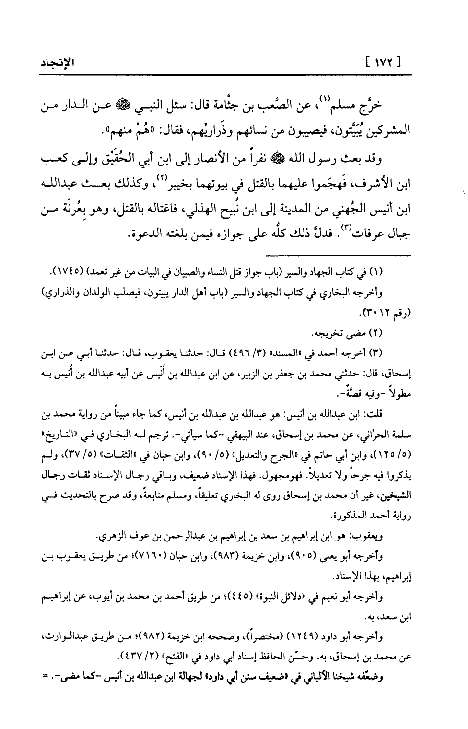 قلت: ابن عبد الله بن أنيس: هو عبد الله بن عبد الله بن أنيس، كما جاء مبيناً من رواية محمد بن سلمة الحرَّاني، عن محمد بن إسحاق، عند البيهقي -كما سيأتي-. ترجم له البخاري في «التاريخ» (5/125) ، وابن أبي حاتم في «الجرح والتعديل» (5/90) ، وابن حبان في «الثقات» (5/37) ، ولم يذكروا فيه جرحاً ولا تعديلاً. فهومجهول. فهذا الإسناد ضعيف، وباقي رجال الإسناد ثقات رجال الشيخين، غير أن محمد بن إسحاق روى له البخاري تعليقاً، ومسلم متابعةً، وقد صرح بالتحديث في رواية أحمد المذكورة.