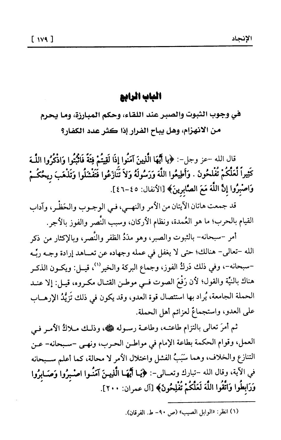 في وجوب الثبوت والصبر عند اللقاء، وحكم المبارزة، وما يحرم