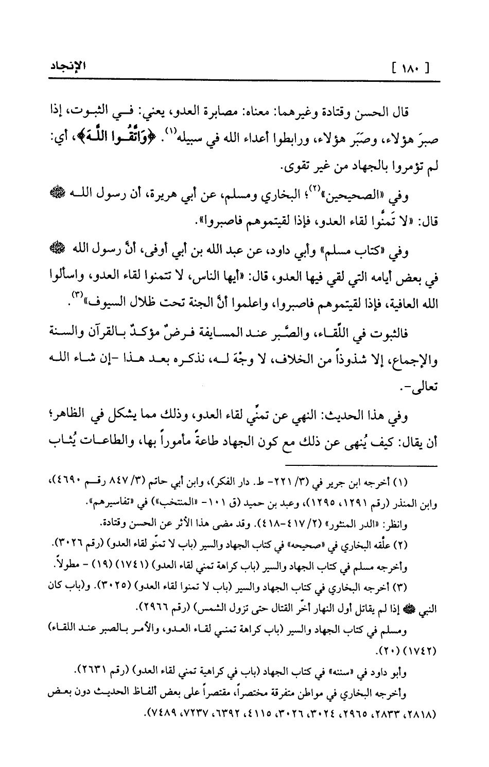 وفي «الصحيحين» (¬2) ؛ البخاري ومسلم، عن أبي هريرة، أن رسول الله - صلى الله عليه وسلم - قال: «لا تَمنَّوا لقاء العدو، فإذا لقيتموهم فاصبروا» .