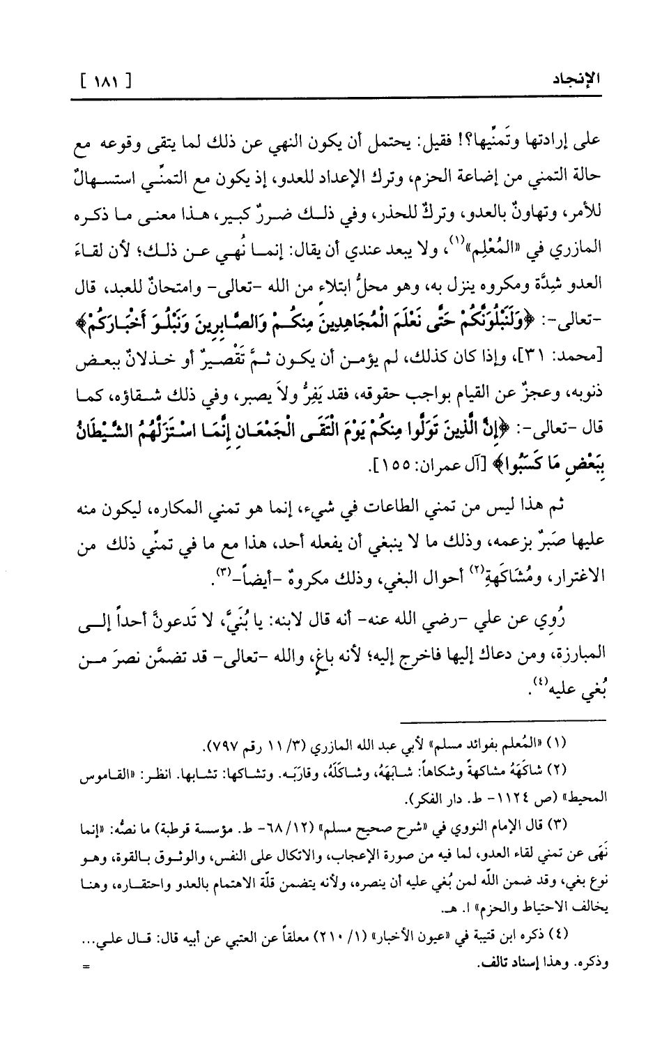 (¬3) قال الإمام النووي في «شرح صحيح مسلم» (12/68- ط. مؤسسة قرطبة) ما نصُّه: «إنما نَهَى عن تمني لقاء العدو، لما فيه من صورة الإعجاب، والاتكال على النفس، والوثوق بالقوة، وهو نوع بغي، وقد ضمن الله لمن بُغي عليه أن ينصره، ولأنه يتضمن قلّة الاهتمام بالعدو واحتقاره، وهنا يخالف الاحتياط والحزم» ا. هـ.