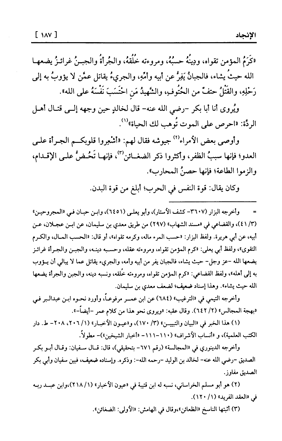 «كَرَمُ المؤمن تقواه، ودِينُهُ حسبُهُ، ومروءته خُلُقهُ، والجُرأةُ والجبنُ غرائزُ يضعها الله حيثُ يشاء، فالجبانُ يَفِرُّ عن أبيه وأمِّهِ، والجريءُ يقاتل عمَّن لا يؤوبُ به إلى رَحْلِهِ، والقَتْلُ حتفٌ من الحُتُوفِ، والشَّهيدُ مَنِ احْتَسَبَ نَفْسَهُ على الله» .