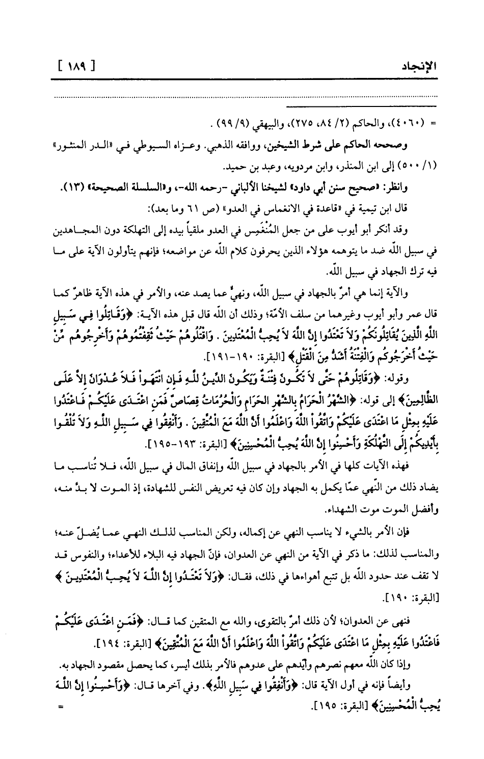 فإن الأمر بالشيء لا يناسب النهي عن إكماله، ولكن المناسب لذلك النهي عما يُضلّ عنه؛ والمناسب لذلك: ما ذكر في الآية من النهي عن العدوان، فإنّ الجهاد فيه البلاء للأعداء؛ والنفوس قد لا تقف عند حدود الله بل تتبع أهواءها في ذلك، فقال: {وَلاَ تَعْتَدُوا إِنَّ اللَّهَ لاَ يُحِبُّ الْمُعْتَدِينَ} [البقرة: 190] .