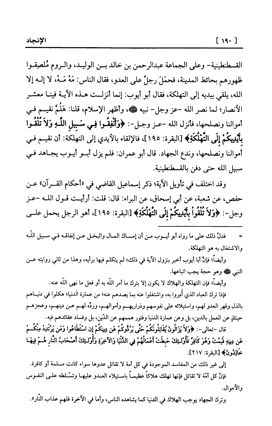 القسطنطينية- وعلى الجماعة عبد الرحمن بن خالد بن الوليد، والروم مُلصِقوا ظهورهم بحائط المدينة، فحمَلَ رجلٌ على العدو، فقال الناس: مَهْ مَهْ، لا إله إلا الله، يلقي بيديه إلى التهلكة، فقال أبو أيوب: إنما أنزلت هذه الآية فينا معشر الأنصار؛ لما نصر الله -عز وجل- نبيه - صلى الله عليه وسلم -، وأظهر الإسلام، قلنا: هَلُمَّ نقيم في أموالنا ونصلحها، فأنزل الله -عز وجل-: {وَأَنْفِقُوا فِي سَبِيلِ اللَّهِ وَلاَ تُلْقُوا بِأَيْدِيكُمْ إِلَى التَّهْلُكَةِ} [البقرة: 195] ، فالإلقاء بالأيدي إلى التهلكة: أن نقيم في أموالنا ونصلحها، وندع الجهاد. قال أبو عمران: فلم يزل أبو أيوب يجاهد في سبيل الله حتى دفن بالقسطنطينية.