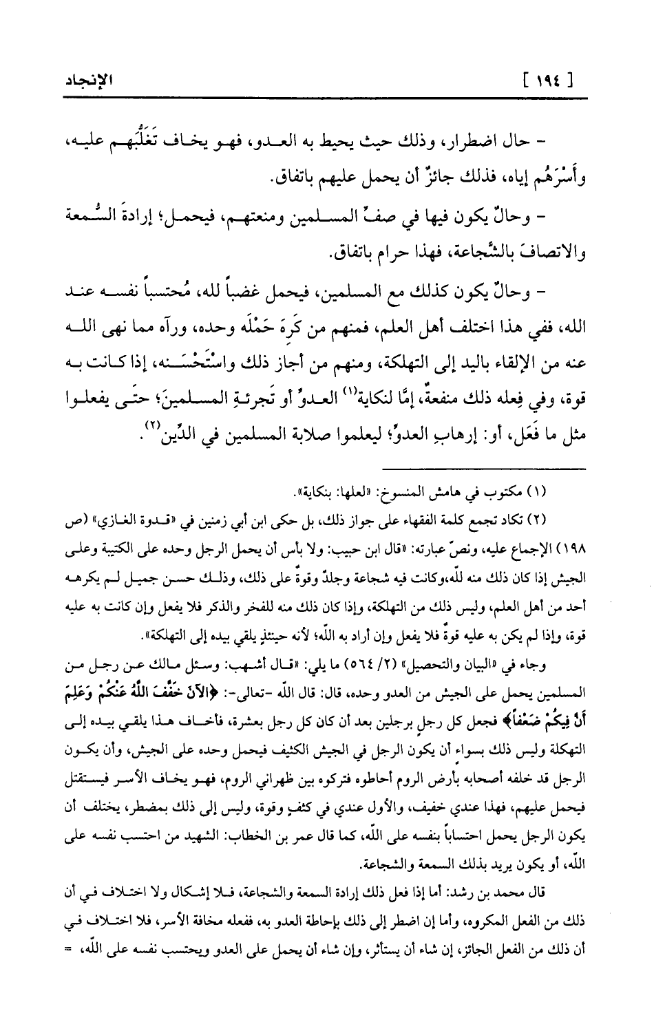 وجاء في «البيان والتحصيل» (2/564) ما يلي: «قال أشهب: وسئل مالك عن رجل من المسلمين يحمل على الجيش من العدو وحده، قال: قال الله -تعالى-: {الآنَ خَفَّفَ اللَّهُ عَنْكُمْ وَعَلِمَ أَنَّ فِيكُمْ ضَعْفاً} فجعل كل رجلٍ برجلين بعد أن كان كل رجل بعشرة، فأخاف هذا يلقي بيده إلى التهكلة وليس ذلك بسواءٍ أن يكون الرجل في الجيش الكثيف فيحمل وحده على الجيش، وأن يكون الرجل قد خلفه أصحابه بأرض الروم أحاطوه فتركوه بين ظهراني الروم، فهو يخاف الأسر فيستقتل فيحمل عليهم، فهذا عندي خفيف، والأول عندي في كثفٍ وقوة، وليس إلى ذلك بمضطر، يختلف أن يكون الرجل يحمل احتساباً بنفسه على الله، كما قال عمر بن الخطاب: الشهيد من احتسب نفسه على الله، أو يكون يريد بذلك السمعة والشجاعة.
