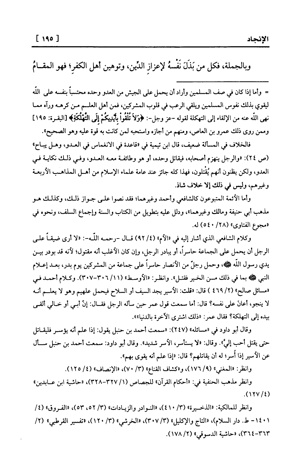 وكلام الشافعي الذي أشار إليه في «الأم» (4/92) قال -رحمه الله-: «لا أرى ضيقاً على الرجل أن يحمل على الجماعة حاسراً، أو يبادر الرجل، وإن كان الأغلب أنه مقتول؛ لأنه قد بودر بين يدي رسول الله - صلى الله عليه وسلم -، وحمل رجلٌ من الأنصار حاسراً على جماعة من المشركين يوم بدر، بعد إعلام النبي - صلى الله عليه وسلم - بما في ذلك من الخير فقتل» . وانظر: «الأوسط» (11/306-307) . وكلام أحمد في «مسائل صالح» (2/469) قال: «قلت: الأسير يجد السيف أو السلاح فيحمل علهيم وهو لا يعلم أنه لا ينجو، أعانَ على نفسه؟ قال: أما سمعت قول عمر حين سأله الرجل فقال: إنّ أبي أو خالي ألقى بيده إلى التهلكة؟ فقال عمر: «ذلك اشترى الآخرة بالدنيا» » .