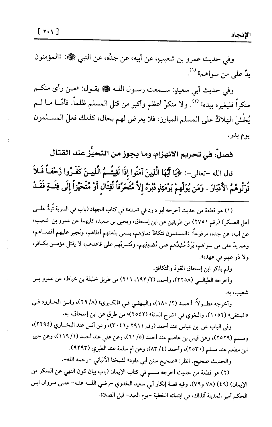 (¬1) هو قطعة من حديث أخرجه أبو داود في «سننه» في كتاب الجهاد (باب في السرية تُردُّ على أهل العسكر) (رقم 2751) من طريقين عن ابن إسحاق، ويحيى بن سعيد، كليهما عن عمرو بن شعيب، عن أبيه، عن جده، مرفوعاً: «المسلمون تتكافأ دماؤهم، يسعى بذمتهم أدناهم، ويُجير عليهم أقصاهم، وهم يدٌ على من سواهم، يَرُدُّ مُشِدُّهم على مُضعِفِهم، ومُتسريِّهم على قاعدهم، لا يقتل مؤمن بكافر، ولا ذو عهدٍ في عهده» .