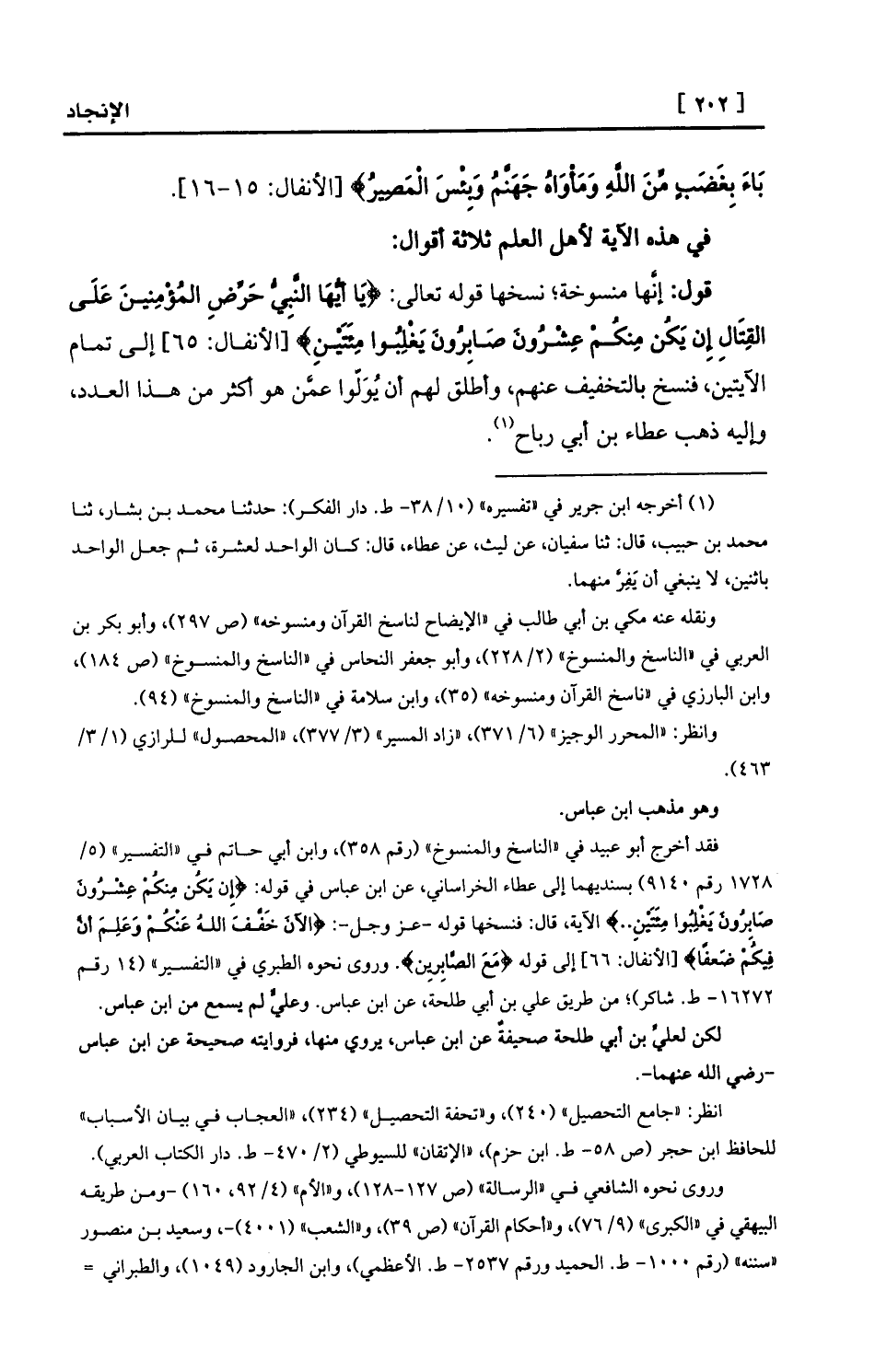 فقد أخرج أبو عبيد في «الناسخ والمنسوخ» (رقم 358) ، وابن أبي حاتم في «التفسير» (5/ 1728 رقم 9140) بسنديهما إلى عطاء الخراساني، عن ابن عباس في قوله: {إِن يَكُن مِنكُمْ عِشْرُونَ صَابِرُونَ يَغْلِبُوا مِئَتَيْنِ..} الآية، قال: فنسخها قوله -عز وجل-: {الآنَ خَفَّفَ اللهُ عَنْكُمْ وَعَلِمَ أنَّ فِيكُمْ ضَعفًا} [الأنفال: 66] إلى قوله {مَعَ الصَّابِريِن} . وروى نحوه الطبري في «التفسير» (14 رقم 16272- ط. شاكر) ؛ من طريق علي بن أبي طلحة، عن ابن عباس. وعليٌّ لم يسمع من ابن عباس.