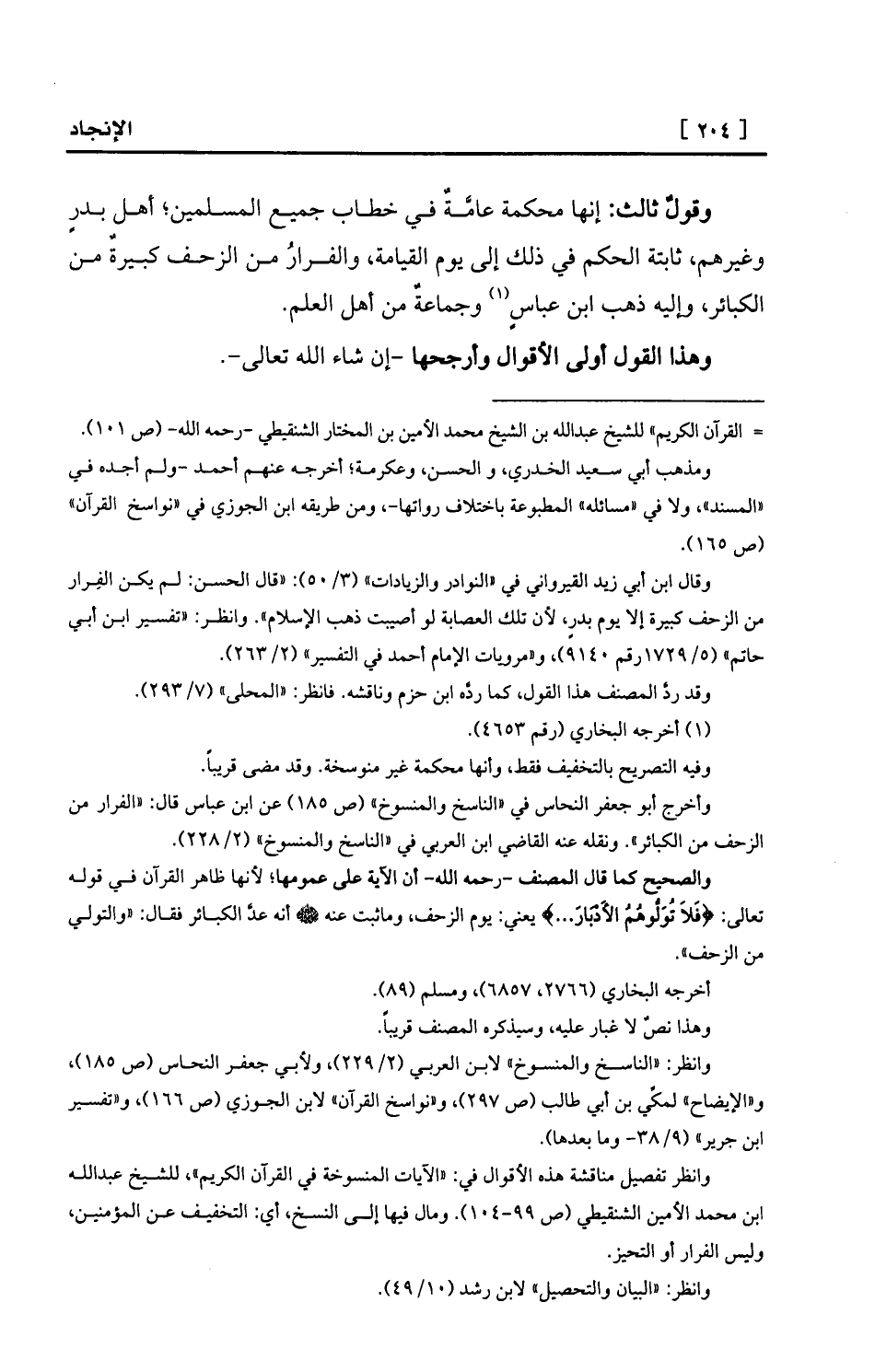 وانظر تفصيل مناقشة هذه الأقوال في: «الآيات المنسوخة في القرآن الكريم» ، للشيخ عبد الله ابن محمد الأمين الشنقيطي (ص 99-104) . ومال فيها إلى النسخ، أي: التخفيف عن المؤمنين، وليس الفرار أو التحيز.