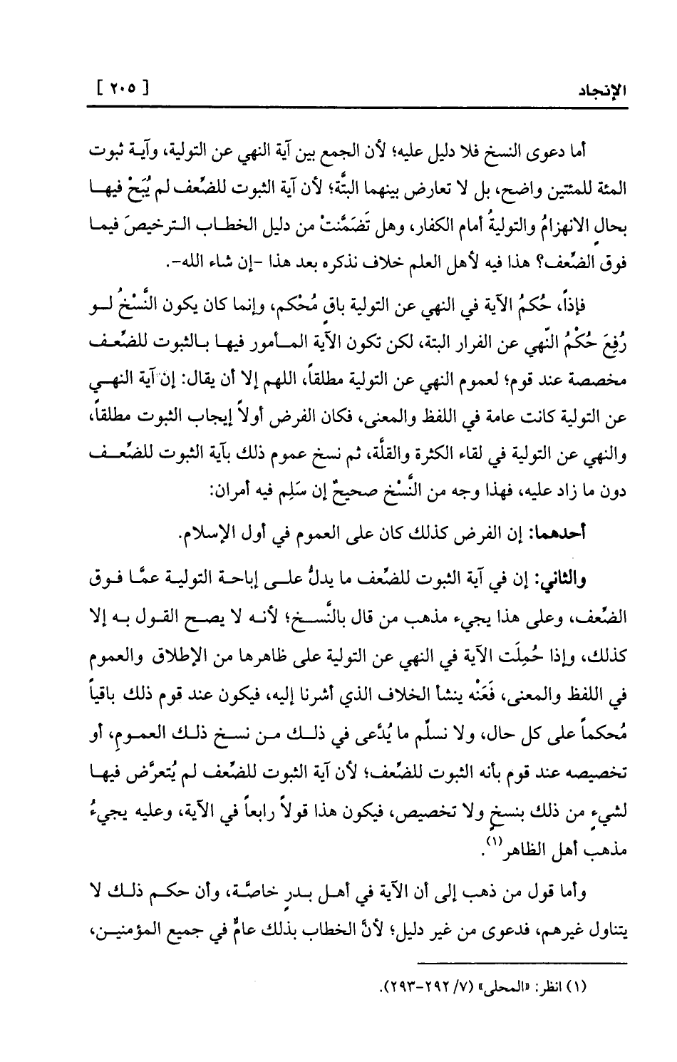 والثاني: إن في آية الثبوت للضِّعف ما يدلُّ على إباحة التولية عمَّا فوق الضِّعف، وعلى هذا يجيء مذهب من قال بالنَّسخ؛ لأنه لا يصح القول به إلا كذلك، وإذا حُمِلَت الآية في النهي عن التولية على ظاهرها من الإطلاق والعموم في اللفظ والمعنى، فَعَنْه ينشأ الخلاف الذي أشرنا إليه، فيكون عند قوم ذلك باقياً مُحكماً على كل حال، ولا نسلِّم ما يُدَّعى في ذلك من نسخ ذلك العمومِ، أو تخصيصه عند قوم بأنه الثبوت للضِّعف؛ لأن آية الثبوت للضِّعف لم يُتعرَّض فيها لشيءٍ من ذلك بنسخٍ ولا تخصيص، فيكون هذا قولاً رابعاً في الآية، وعليه يجيءُ مذهب أهل الظاهر (¬1) .