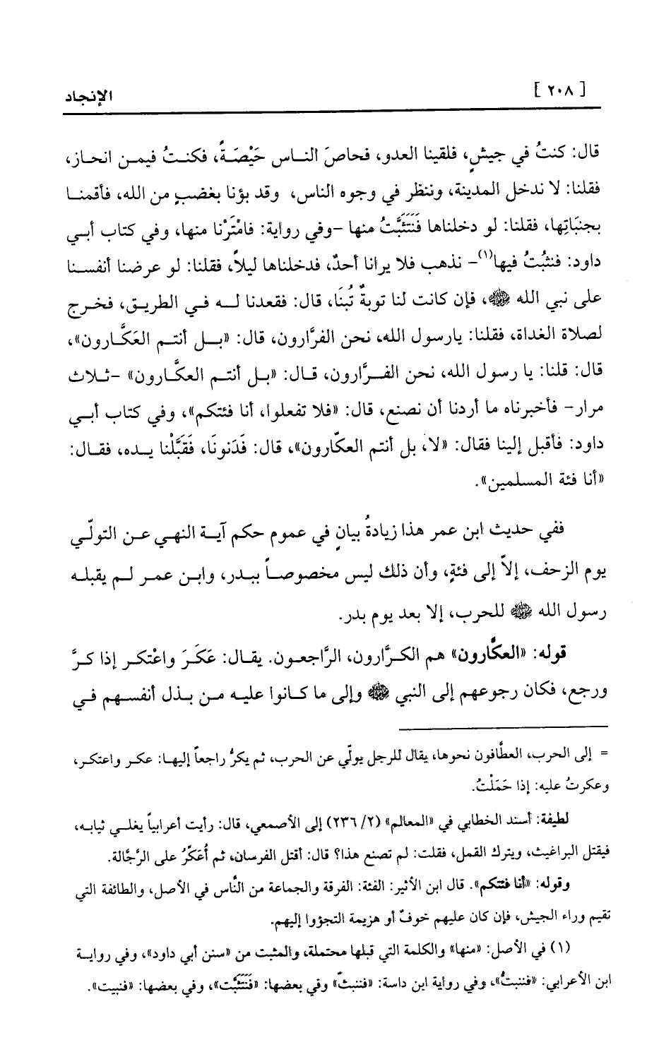 على نبي الله - صلى الله عليه وسلم -، فإن كانت لنا توبةٌ تُبنَا، قال: فقعدنا له في الطريق، فخرج لصلاة الغداة، فقلنا: يارسول الله، نحن الفرَّارون، قال: «بل أنتم العَكَّارون» ، قال: قلنا: يا رسول الله، نحن الفرَّارون، قال: «بل أنتم العكَّارون» -ثلاث مرار- فأخبرناه ما أردنا أن نصنع، قال: «فلا تفعلوا، أنا فئتكم» ، وفي كتاب أبي داود: فأقبل إلينا فقال: «لا، بل أنتم العكّارون» ، قال: فَدَنونَا، فَقَبَّلْنا يده، فقال: «أنا فئة المسلمين» .