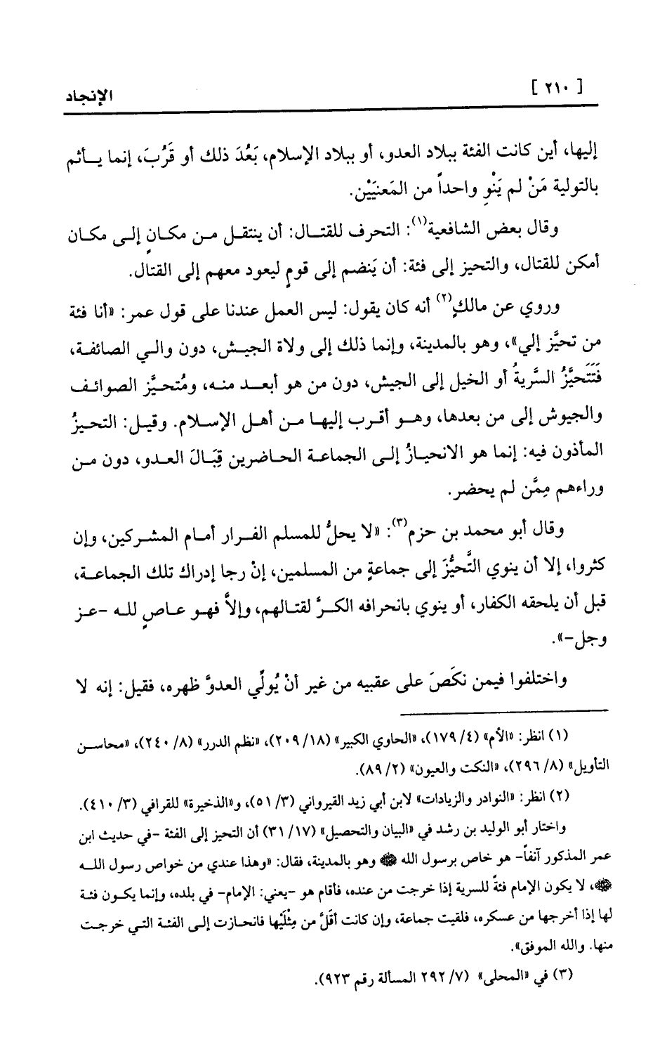 وقال أبو محمد بن حزم (¬3) : «لا يحلُّ للمسلم الفرار أمام المشركين، وإن كثروا، إلا أن ينوي التَّحيُّزَ إلى جماعةٍ من المسلمين، إنْ رجا إدراك تلك الجماعة، قبل أن يلحقه الكفار، أو ينوي بانحرافه الكرَّ لقتالهم، وإلاَّ فهو عاصٍ لله -عز وجل-