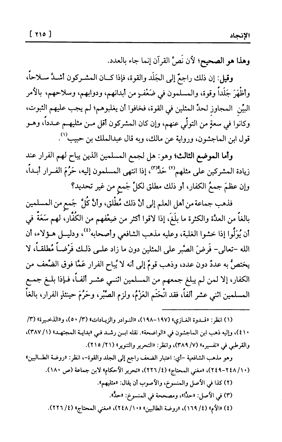 وقيل: إن ذلك راجعٌ إلى الجَلَد والقوة، فإذا كان المشركون أشدَّ سلاحاً، وأظْهَرَ جَلَداً وقوة، والمسلمون في ضَعْفٍ من أبدانهم، ودوابهم، وسلاحهم، بالأمر البيِّنِ المجاوزِ لحدِّ المثلين في القوة، فخافوا أن يغلبوهم؛ لم يجب عليهم الثبوت، وكانوا في سعةٍ من التولِّي عنهم، وإن كان المشركون أقل من مثليهم عدداً، وهو قول ابن الماجشون، ورواية عن مالك، وبه قال عبد الملك بن حبيب (¬1) .
