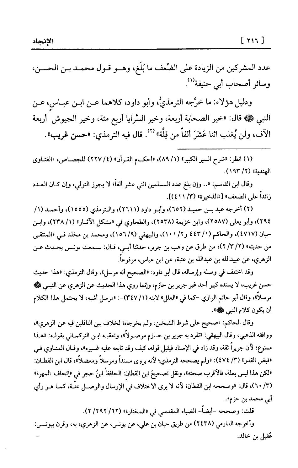 وقال الحاكم: «صحيح على شرط الشيخين، ولم يخرجاه؛ لخلاف بين الناقلين فيه عن الزهري» ، ووافقه الذهبي، وقال البيهقي: «تفرد به جرير بن حازم موصولاً» ، وتعقبه ابن التركماني بقوله: «هذا ممنوع؛ لأن جريراً ثقة، وقد زاد في الإسناد فيقبل قوله، كيف وقد تابعه عليه غيره» ، وقال المناوي في «فيض القدر» (3/474) : «ولم يصححه الترمذي؛ لأنه يروى مسنداً ومرسلاً ومعضلاً» ، قال ابن القطان: «لكن هذا ليس بعلة، فالأقرب صحته» ، ونقل تصحيحَ ابن القطانِ: الحافظُ ابنُ حجر في «إتحاف المهرة» (3/60) ، قال: «وصححه ابن القطان؛ لأنه لا يرى الاختلاف في الإرسال والوصل علّة، كما هو رأي أبي محمد بن حزم» .