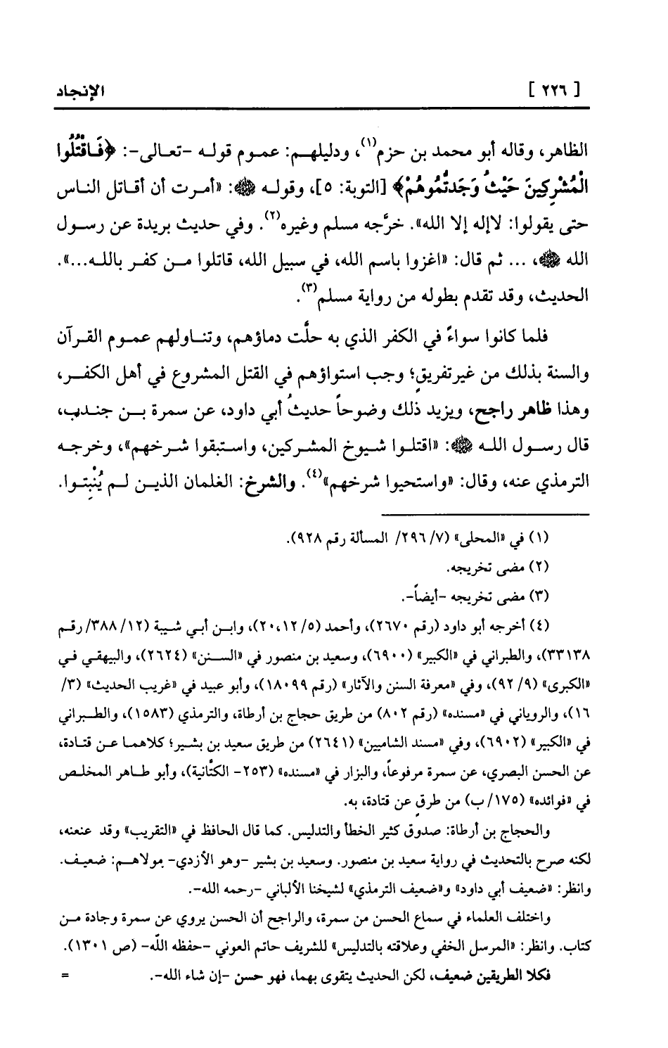 فلما كانوا سواءً في الكفر الذي به حلَّت دماؤهم، وتناولهم عموم القرآن والسنة بذلك من غيرتفريقٍ؛ وجب استواؤهم في القتل المشروع في أهل الكفر، وهذا ظاهر راجح، ويزيد ذلك وضوحاً حديثُ أبي داود، عن سمرة بن جندب، قال رسول الله - صلى الله عليه وسلم -: «اقتلوا شيوخ المشركين، واستبقوا شرخهم» ، وخرجه الترمذي عنه، وقال: «واستحيوا شرخهم» (¬4) . والشرخ: الغلمان الذين لم يُنْبِتوا.