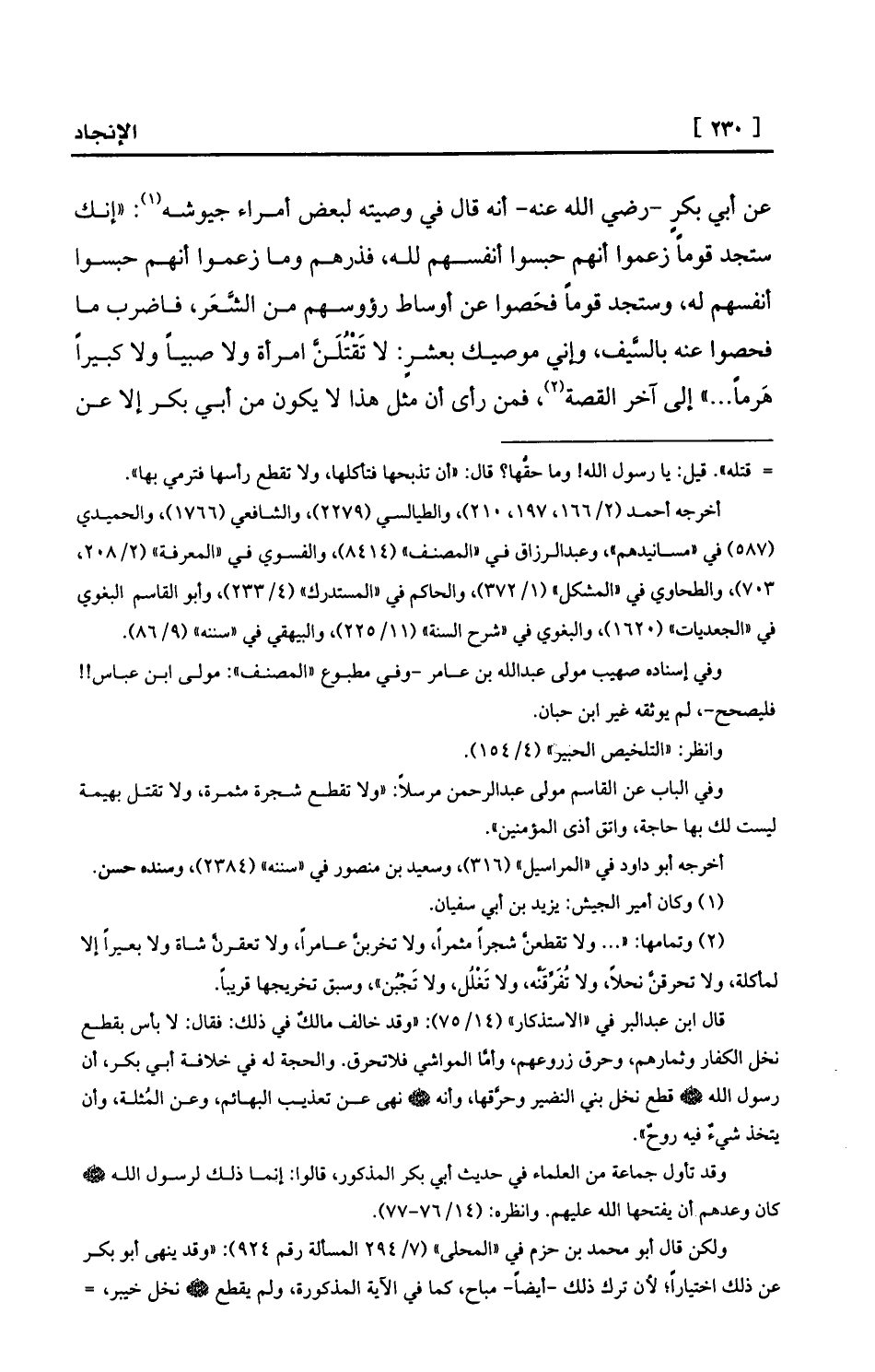 (¬2) وتمامها: « ... ولا تقطعنَّ شجراً مثمراً، ولا تخربنَّ عامراً، ولا تعقرنَّ شاة ولا بعيراً إلا لمأكلة، ولا تحرقنَّ نحلاً، ولا تُفَرِّقَنَّه، ولا تَغْلُل، ولا تَجْبُن» ، وسبق تخريجها قريباً.