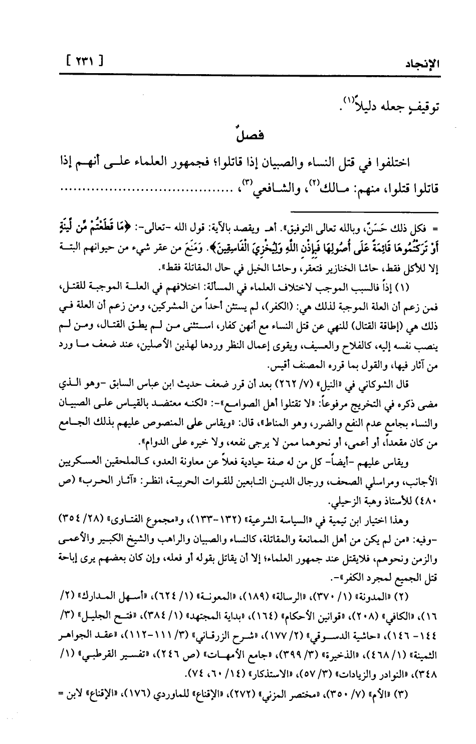 (¬1) إذاً فالسبب الموجب لاختلاف العلماء في المسألة: اختلافهم في العلة الموجبة للقتل، فمن زعم أن العلة الموجبة لذلك هي: (الكفر) ، لم يستثن أحداً من المشركين، ومن زعم أن العلة في ذلك هي (إطاقة القتال) للنهي عن قتل النساء مع أنهن كفار، استثنى من لم يطق القتال، ومن لم ينصب نفسه إليه، كالفلاح والعسيف، ويقوى إعمال النظر وردها لهذين الأصلين، عند ضعف ما ورد من آثار فيها، والقول بما قرره المصنف أقيس.