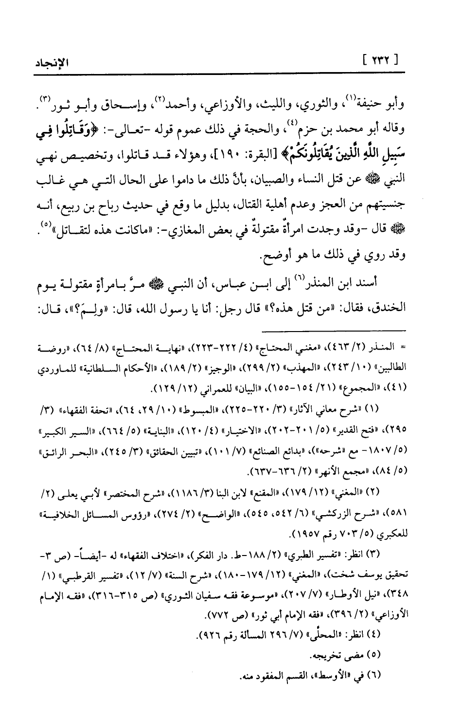 حنيفة (¬1) ، والثوري، والليث، والأوزاعي، وأحمد (¬2) ، وإسحاق وأبو ثور (¬3) . وقاله أبو محمد بن حزم (¬4) ، والحجة في ذلك عموم قوله -تعالى-: {وَقَاتِلُوا فِي سَبِيلِ اللَّهِ الَّذِينَ يُقَاتِلُونَكُمْ} [البقرة: 190] ، وهؤلاء قد قاتلوا، وتخصيص نهي النبي - صلى الله عليه وسلم - عن قتل النساء والصبيان، بأنَّ ذلك ما داموا على الحال التي هي غالب جنسيتهم من العجز وعدم أهلية القتال، بدليل ما وقع في حديث رباح بن ربيع، أنه - صلى الله عليه وسلم - قال -وقد وجدت امرأةٌ مقتولةٌ في بعض المغازي-: «ماكانت هذه لتقاتل» (¬5) . وقد روي في ذلك ما هو أوضح.
