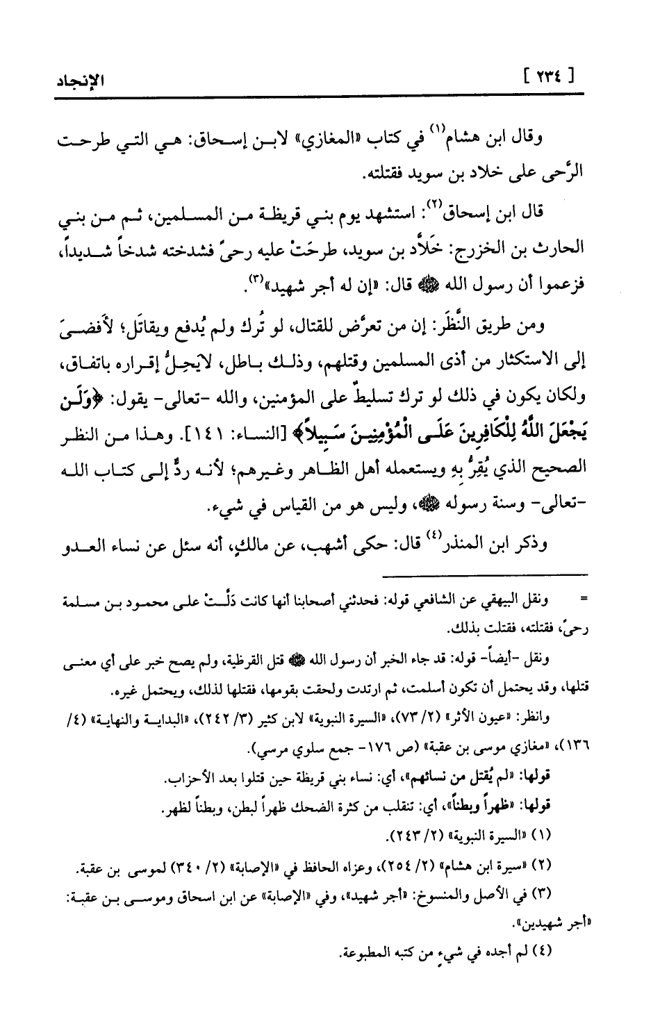 ونقل -أيضاً- قوله: قد جاء الخبر أن رسول الله - صلى الله عليه وسلم - قتل القرظية، ولم يصح خبر على أي معنى قتلها، وقد يحتمل أن تكون أسلمت، ثم ارتدت ولحقت بقومها، فقتلها لذلك، ويحتمل غيره.