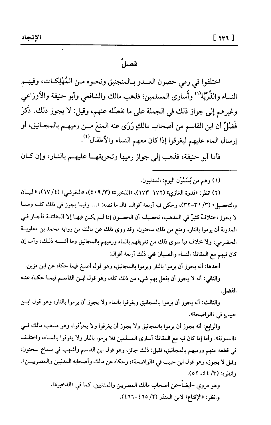 (¬2) انظر: «قدوة الغازي» (172-173) ، «الذخيرة» (3/409) ، «الخرشي» (4/17) ، «البيان والتحصيل» (3/31-32) ، وحكى فيه أربعة أقوال، قال ما نصه: « ... وفيما يجوز في ذلك كله ومما لا يجوز اختلافٌ كثيرٌ في المذهب، تحصيله أن الحصون إذا لم يكن فيها إلا المقاتلة فأجاز في المدونة أن يرموا بالنار، ومنع من ذلك سحنون، وقد روى ذلك عن مالك من رواية محمد بن معاوية الحضرمي، ولا خلاف فيا سوى ذلك من تغريقهم بالماء ورميهم بالمجانيق وما أشبه ذلك، وأما إن كان فيهم مع المقاتلة النساء والصبيان ففي ذلك أربعة أقوال: