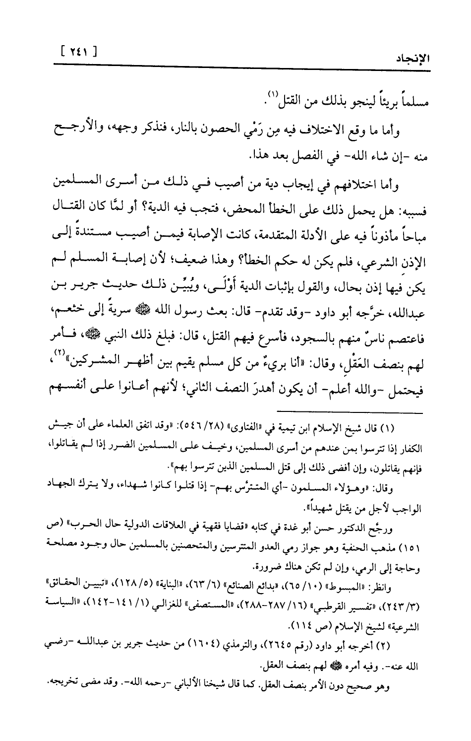 وأما اختلافهم في إيجاب دية من أصيب في ذلك من أسرى المسلمين فسببه: هل يحمل ذلك على الخطأ المحض، فتجب فيه الدية؟ أو لمَّا كان القتال مباحاً مأذوناً فيه على الأدلة المتقدمة، كانت الإصابة فيمن أصيب مستندةً إلى الإذنِ الشرعي، فلم يكن له حكم الخطأ؟ وهذا ضعيف؛ لأن إصابة المسلم لم يكن فيها إذن بحال، والقول بإثبات الدية أَوْلَى، ويُبيِّن ذلك حديث جرير بن عبد الله، خرَّجه أبو داود -وقد تقدم- قال: بعث رسول الله - صلى الله عليه وسلم - سريةً إلى خثعم، فاعتصم ناسٌ منهم بالسجود، فأسرع فيهم القتل، قال: فبلغ ذلك النبي - صلى الله عليه وسلم -، فأمر لهم بنصف العَقْلِ، وقال: «أنا بريءٌ من كل مسلم يقيم بين أظهر المشركين» (¬2) ، فيحتمل -والله أعلم- أن يكون أهدرَ النصف الثاني؛ لأنهم أعانوا على أنفسهم