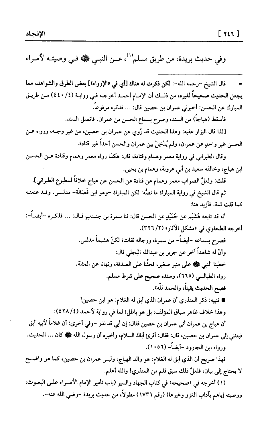 فهذا صريح أن الذي أبق له الغلام: هو والد الهياج، وليس عمران بن حصين، كما هو واضح لا يحتاج إلى بيان، فلعلَّ ذلك سبق قلم من المنذري! والله أعلم.