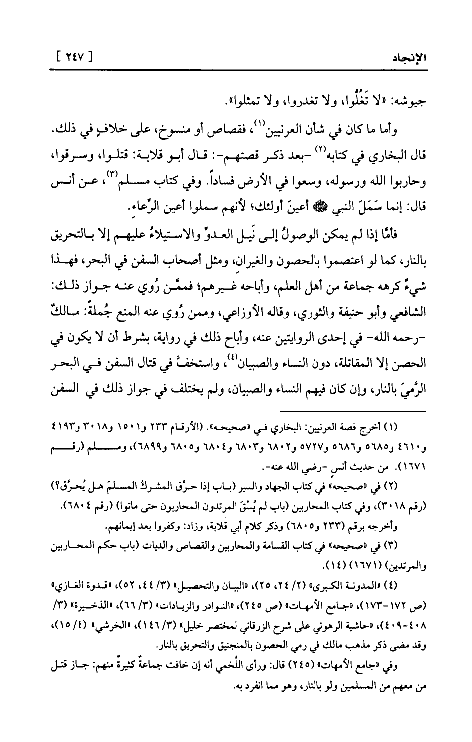 (¬4) «المدونة الكبرى» (2/24، 25) ، «البيان والتحصيل» (3/44، 52) ، «قدوة الغازي» (ص 172-173) ، «جامع الأمهات» (ص 245) ، «النوادر والزيادات» (3/66) ، «الذخيرة» (3/ 408-409) ، «حاشية الرهوني على شرح الزرقاني لمختصر خليل» (3/146) ، «الخرشي» (4/15) ، وقد مضى ذكر مذهب مالك في رمي الحصون بالمنجنيق والتحريق بالنار.