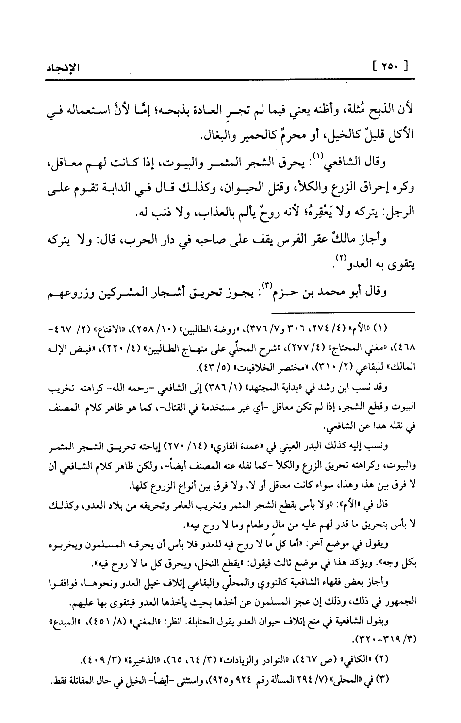 ويقول في موضع آخر: «أما كل ما لا روح فيه للعدو فلا بأس أن يحرقه المسلمون ويخربوه بكل وجه» . ويؤكد هذا في موضع ثالث فيقول: «يقطع النخل، ويحرق كل ما لا روح فيه» .