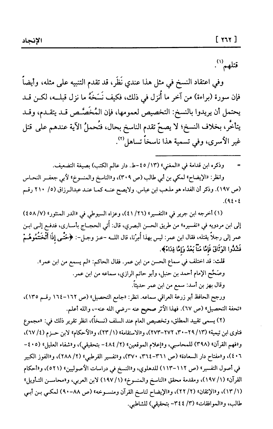 (¬2) يسمى تقييد المطلق، وتخصيص العام عند السلف (نسخاً) ، انظر تقرير ذلك في: «مجموع فتاوى ابن تيمية» (13/29-30، 272-273) ، و «الاستقامة» (1/23) ، و «الأحكام» لابن حزم (4/67) ، و «فهم القرآن» (398) للمحاسبي، و «إعلام الموقعين» (2/484- بتحقيقي) ، و «شفاء العليل» (405-406) ، و «مفتاح دار السعادة» (ص 361-364، 370) ، و «تفسير القرطبي» (2/288) ، و «الفوز الكبير في أصول التفسير» (ص 112-113) للدهلوي، و «النسخ في دراسات الأصوليين» (521) ، و «أحكام القرآن» (1/197) ، ومقدمة محقق «الناسخ والمنسوخ» (1/197) لابن العربي، و «محاسن التأويل» (1/13) ، و «الإتقان» (2/22) ، و «الإيضاح لناسخ القرآن ومنسوخه» (ص 88-90) لمكي بن أبي طالب، و «الموافقات» (3/344- بتحقيقي) للشاطبي.