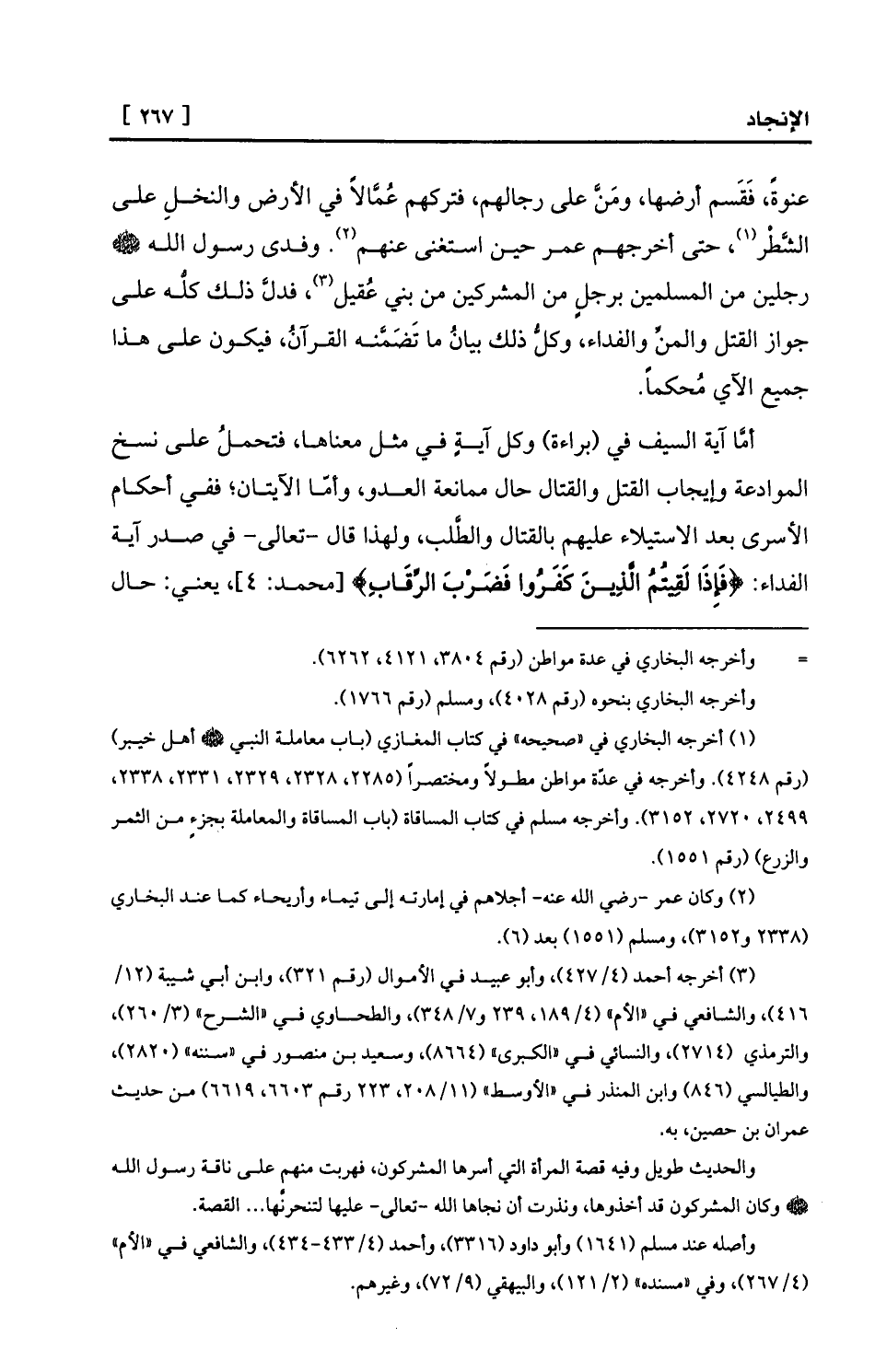 الله - صلى الله عليه وسلم - رجلين من المسلمين برجلٍ من المشركين من بني عُقيل (¬3) ، فدلَّ ذلك كلُّه على جواز القتل والمنِّ والفداء، وكلُّ ذلك بيانُ ما تَضَمَّنه القرآنُ، فيكون على هذا جميع الآي مُحكماً.