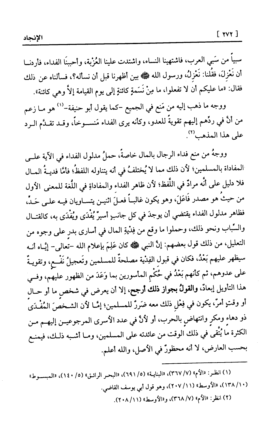 ووجهُ من منع فداء الرجال بالمال خاصةً، حملُ مدلول الفداء في الآية على المفاداة بالمسلمين؛ لأن ذلك مما لا يُختلفُ في أنه يتناوله اللفظُ؛ فأمَّا فديةُ المال فلا دليل على أنَّه مرادٌ في اللَّفظ؛ لأن ظاهر الفداءِ والمفاداةِ في اللُّغة للمعنى الأول من حيثُ هو مصدر فَاعَلَ، وهو يكون غالباً فعلَ اثنين يتساويان فيه على حَدٍّ، فظاهر مدلول الفداء يقتضي أن يوجدَ في كل جانبٍ أسيرٌ يُفْدَى ويُفْدَى به، كالقتال والسِّباب ونحو ذلك، وحملوا ما وقع من فِدْيةِ المال في أسارى بدرٍ على وجوه من التعليل، من ذلك قول بعضهم: إنَّ النبي - صلى الله عليه وسلم - كان عَلِمَ بإعلام الله -تعالى- إيَّاه أنه سيظهر عليهم بَعْدُ، فكان في قبولِ الفِدْية مصلحةٌ للمسلمين وتَعجيلُ نَفْعٍ، وتقويةٌ على عدوهم، ثم كأنهم بَعْدُ في حُكْمِ المأسورين بما وَعَدَ من الظهور عليهم، وفي هذا التأويل إبعادٌ، والقولُ بجواز ذلك أرجح، إلا أن يعرض في شخصٍ ما أو حالٍ أو وقتٍ أمرٌ، يكون في فِعْلِ ذلك معه ضَررٌ للمسلمين؛ إمَّا لأن الشخصَ المُفْدَى ذو دهاءٍ ومكرٍ وانتهاضٍ بالحرب، أو لأنَّ في عدد الأسرى المرجوعين إليهم من الكثرة ما يُتَّقى في ذلك الوقت من عائدته على المسلمين، وما أشبه ذلك، فيمنع بحسب العارض، لا أنه محظورٌ في الأصل، والله أعلم.