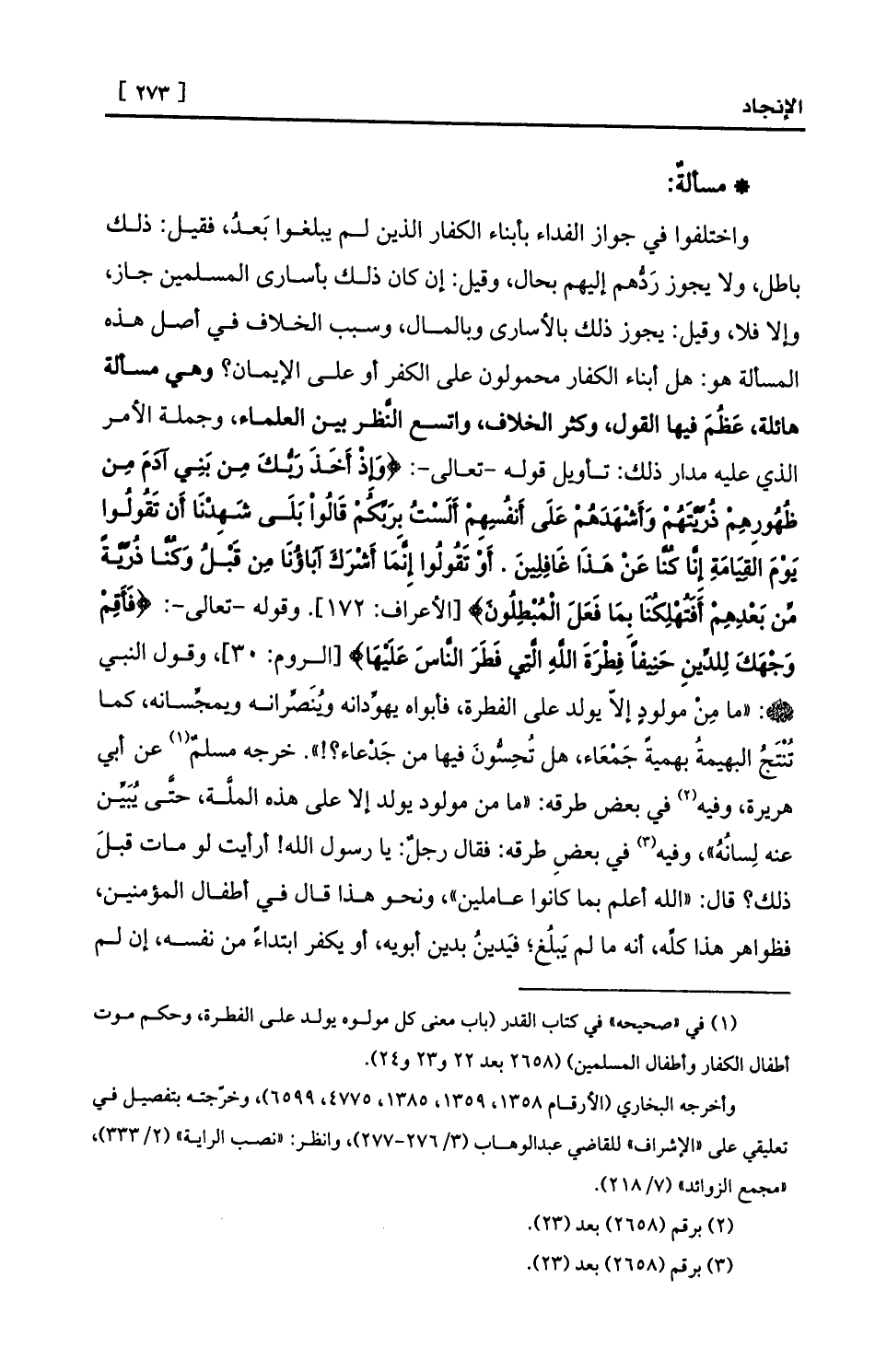واختلفوا في جواز الفداء بأبناء الكفار الذين لم يبلغوا بَعدُ، فقيل: ذلك باطل، ولا يجوز رَدُّهم إليهم بحال، وقيل: إن كان ذلك بأسارى المسلمين جاز، وإلا فلا، وقيل: يجوز ذلك بالأسارى وبالمال، وسبب الخلاف في أصل هذه المسألة هو: هل أبناء الكفار محمولون على الكفر أو على الإيمان؟ وهي مسألة هائلة، عَظُمَ فيها القول، وكثر الخلاف، واتسع النَّظر بين العلماء، وجملة الأمر الذي عليه مدار ذلك: تأويل قوله -تعالى-: {وَإِذْ أَخَذَ رَبُّكَ مِن بَنِي آدَمَ مِن ظُهُورِهِمْ ذُرِّيَّتَهُمْ وَأَشْهَدَهُمْ عَلَى أَنفُسِهِمْ أَلَسْتُ بِرَبِّكُمْ قَالُواْ بَلَى شَهِدْنَا أَن تَقُولُوا يَوْمَ القِيَامَةِ إِنَّا كُنَّا عَنْ هَذَا غَافِلِينَ. أَوْ تَقُولُوا إِنَّمَا أَشْرَكَ آبَاؤُنَا مِن قَبْلُ وَكُنَّا ذُرِّيَّةً مِّن بَعْدِهِمْ أَفَتُهْلِكُنَا بِمَا فَعَلَ الْمُبْطِلُونَ} [الأعراف: 172] . وقوله -تعالى-: {فَأَقِمْ وَجْهَكَ لِلدِّينِ حَنِيفاً فِطْرَةَ اللَّهِ الَّتِي فَطَرَ النَّاسَ عَلَيْهَا} [الروم: 30] ، وقول النبي - صلى الله عليه وسلم -: «ما مِنْ مولودٍ إلاّ يولد على الفطرة، فأبواه يهوِّدانه ويُنَصِّرانه ويمجِّسانه، كما تُنْتَجُ البهيمةُ بهميةً جَمْعَاء، هل تُحِسُّونَ فيها من جَدْعاء؟!» . خرجه مسلمٌ (¬1) عن