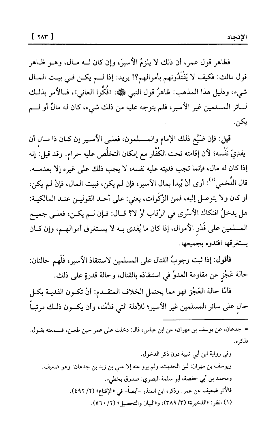 فأقول: إذا ثبت وجوبُ القتال على المسلمين لاستنقاذ الأسير، فَلَهم حالتان: حالة عَجْزٍ عن مقاومة العدوِّ في استنقاذه بالقتال، وحالة قدرةٍ على ذلك.